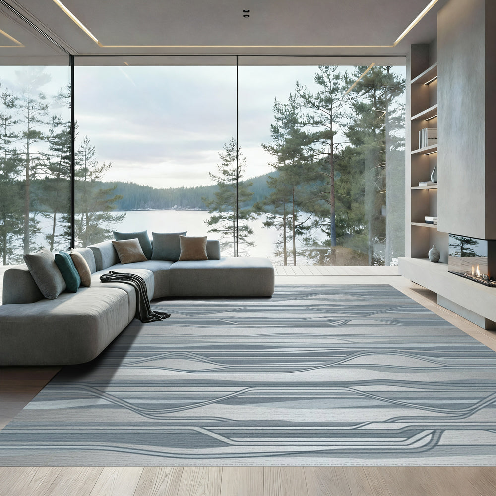 Deep Blue Wavy Contemporary Landscape Rug