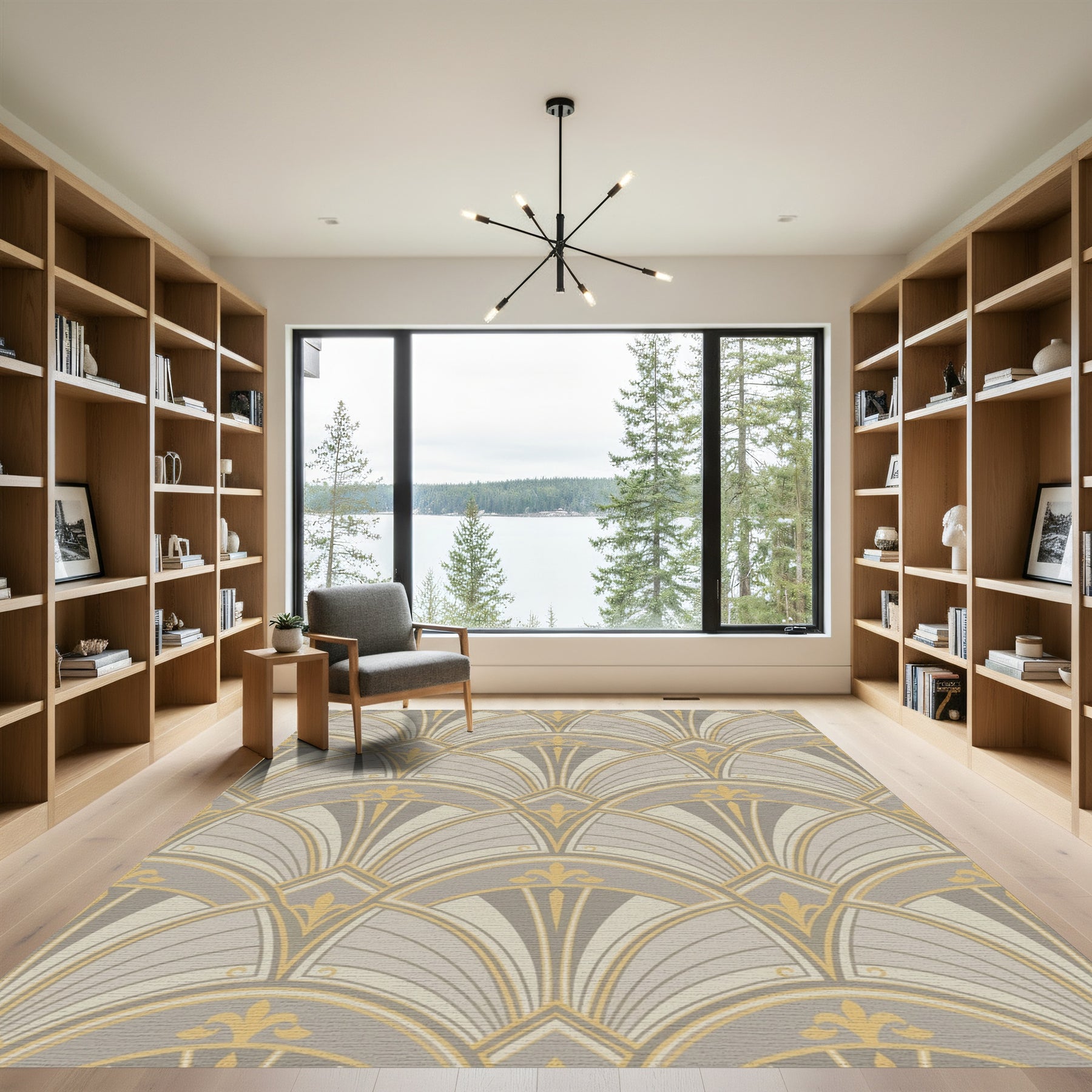 Flatwoven High Traffic Area Rug, Art Deco Gray Golden Fan Rug, Non Slip, Stain Resistant, Washable Area Rugs for Living Room, Bedroom Overview: