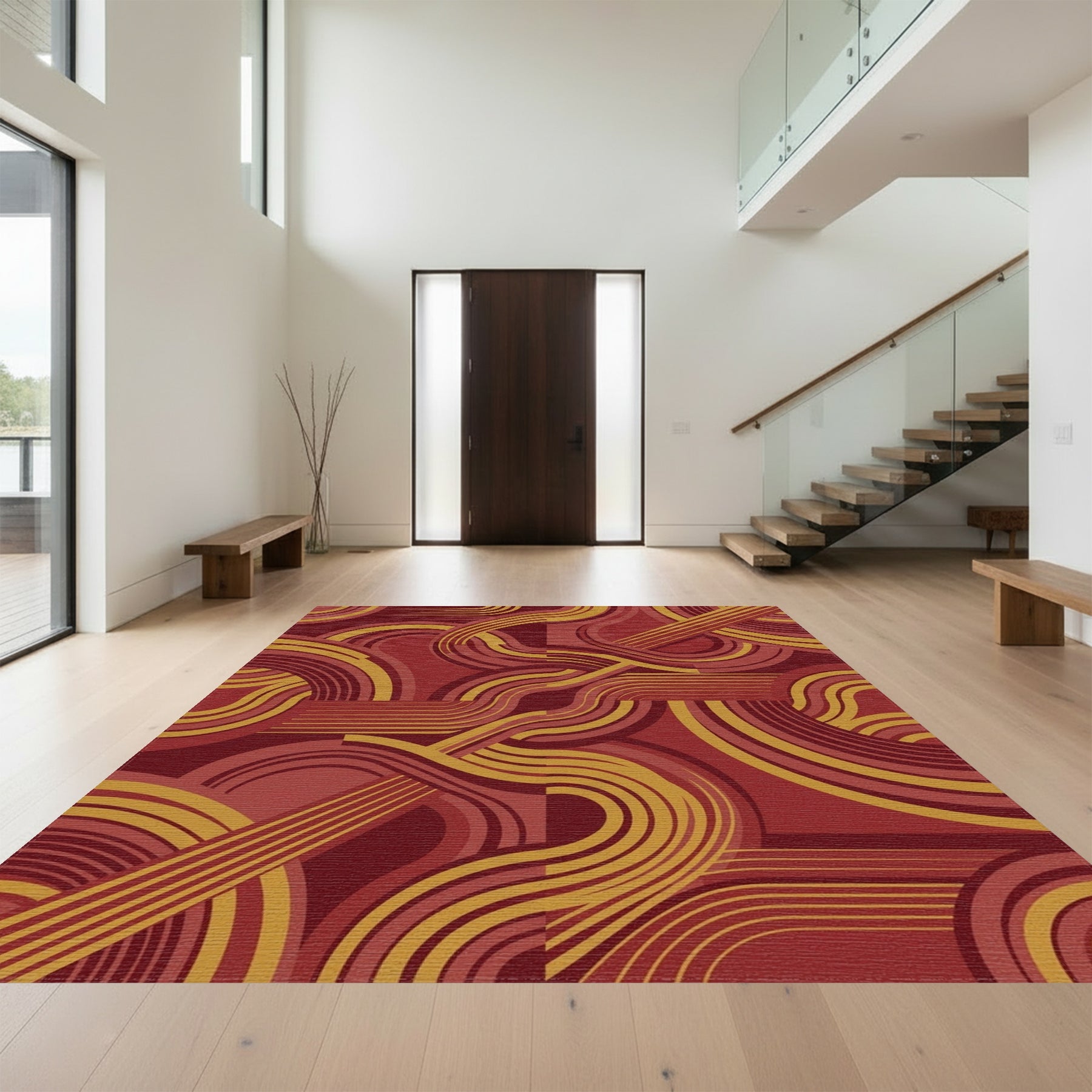 Flatwoven High Traffic Area Rug, Crimson Gold Swirl Mid Century Rug, Non Slip, Stain Resistant, Washable Area Rugs for Living Room, Bedroom Overview: