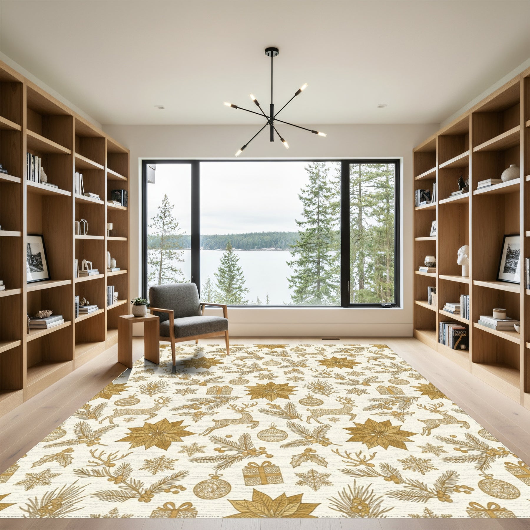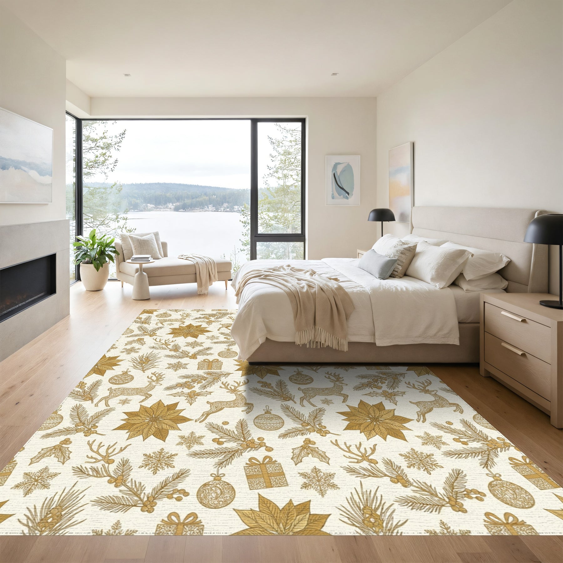 Flatwoven High Traffic Area Rug, Golden Holiday Reindeer Poinsettia Ornaments Rug, Non Slip, Stain Resistant, Washable Area Rugs for Living Room, Bedroom Overview:
