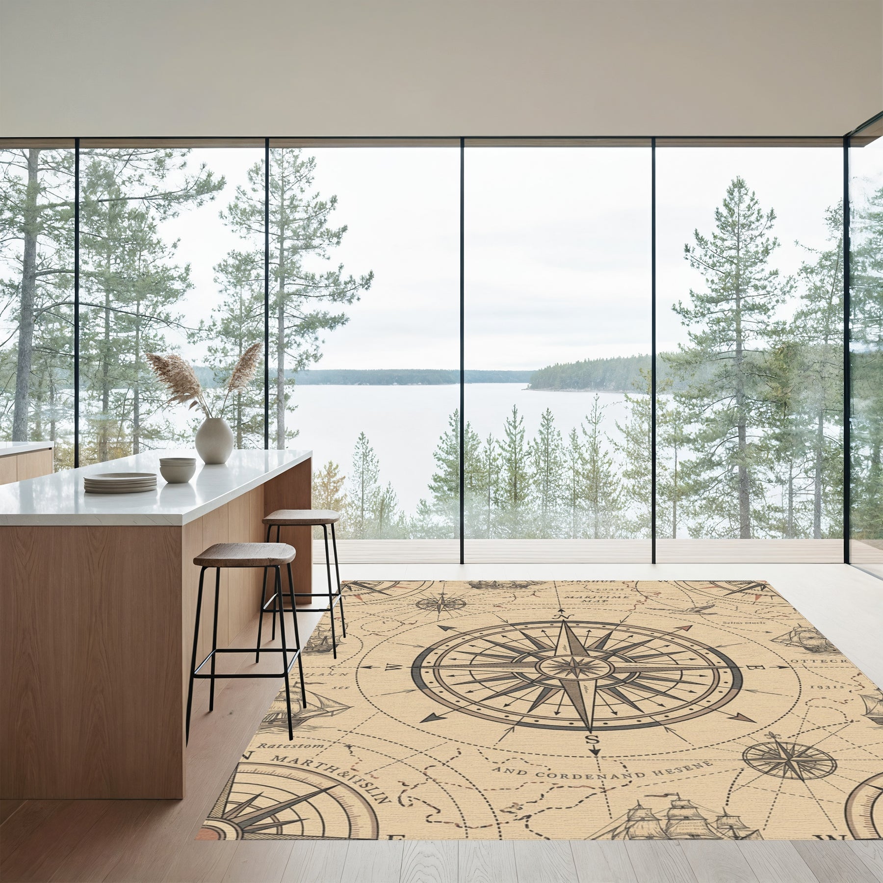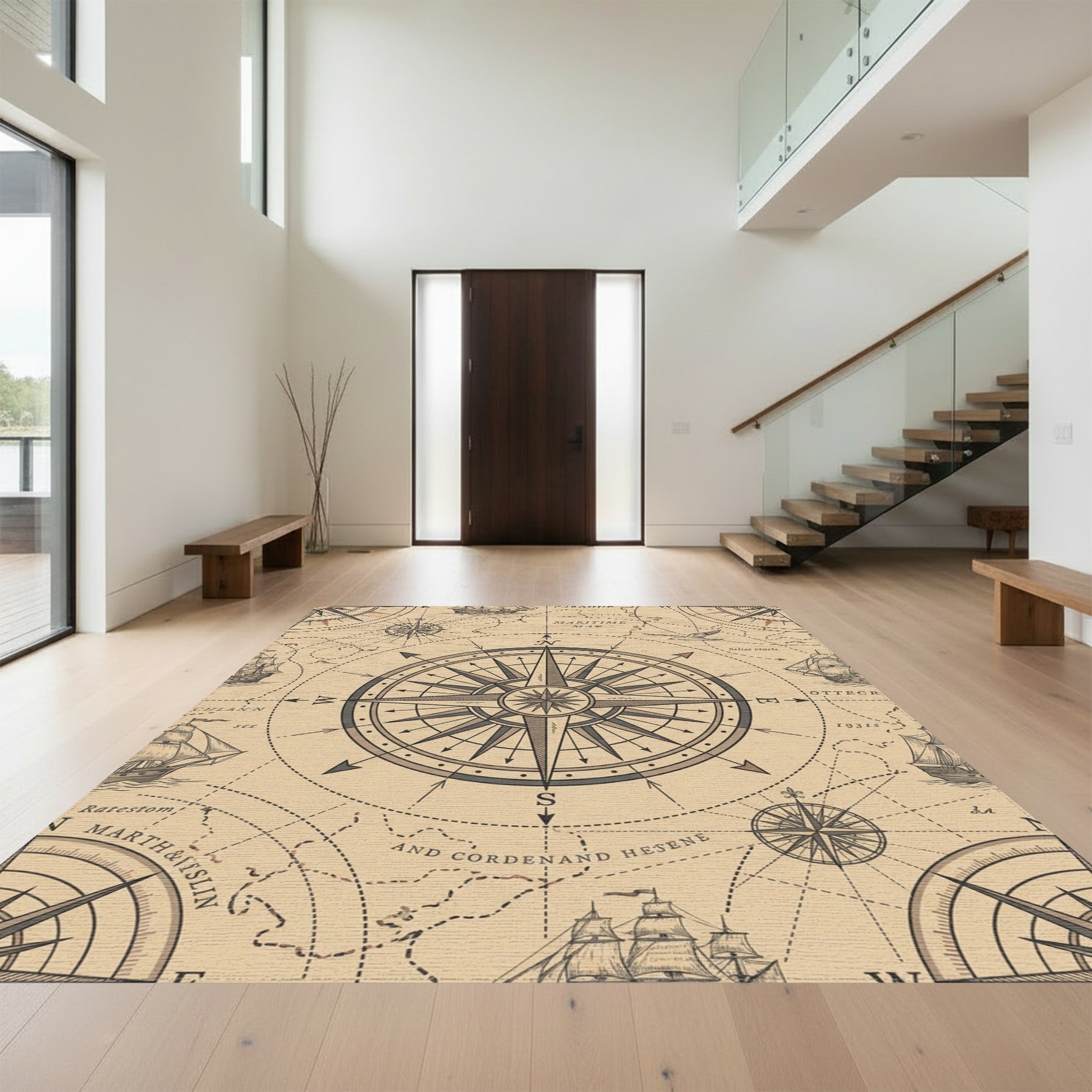 Flatwoven High Traffic Area Rug, Vintage Nautical Compass Marine Map Rug, Non Slip, Stain Resistant, Washable Area Rugs for Living Room, Bedroom Overview: