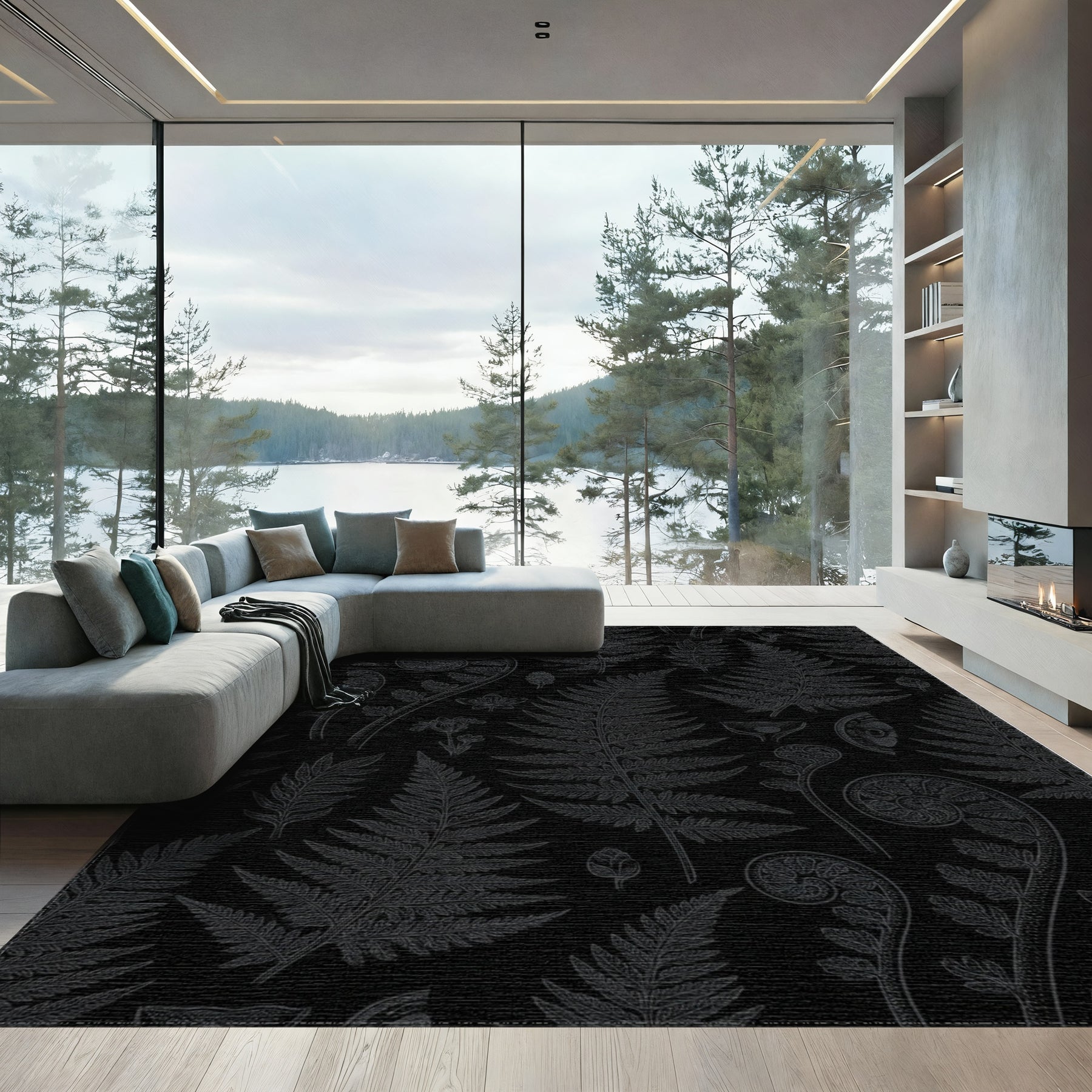 Flatwoven High Traffic Area Rug, Dark Charcoal Fern Botanical Illustration Rug, Non Slip, Stain Resistant, Washable Area Rugs for Living Room, Bedroom Overview: