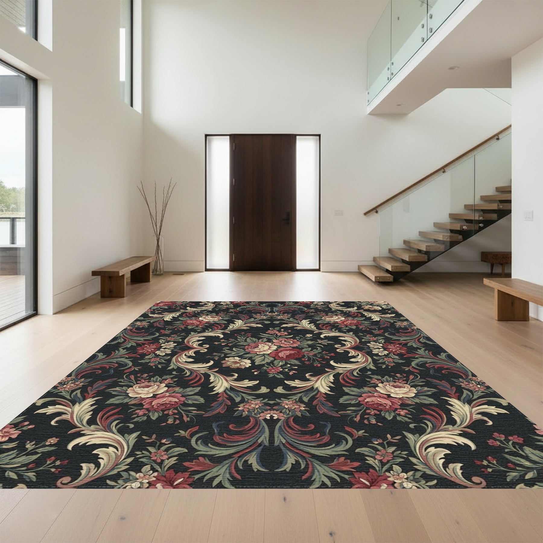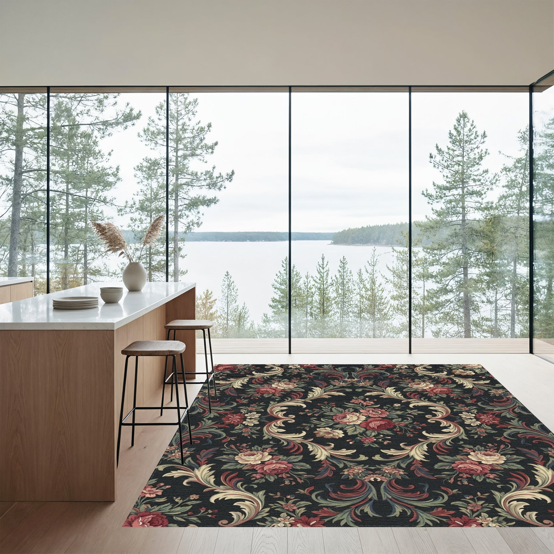 Flatwoven High Traffic Area Rug, Victorian Red Floral Scroll Arrangement Rug, Non Slip, Stain Resistant, Washable Area Rugs for Living Room, Bedroom Overview:
