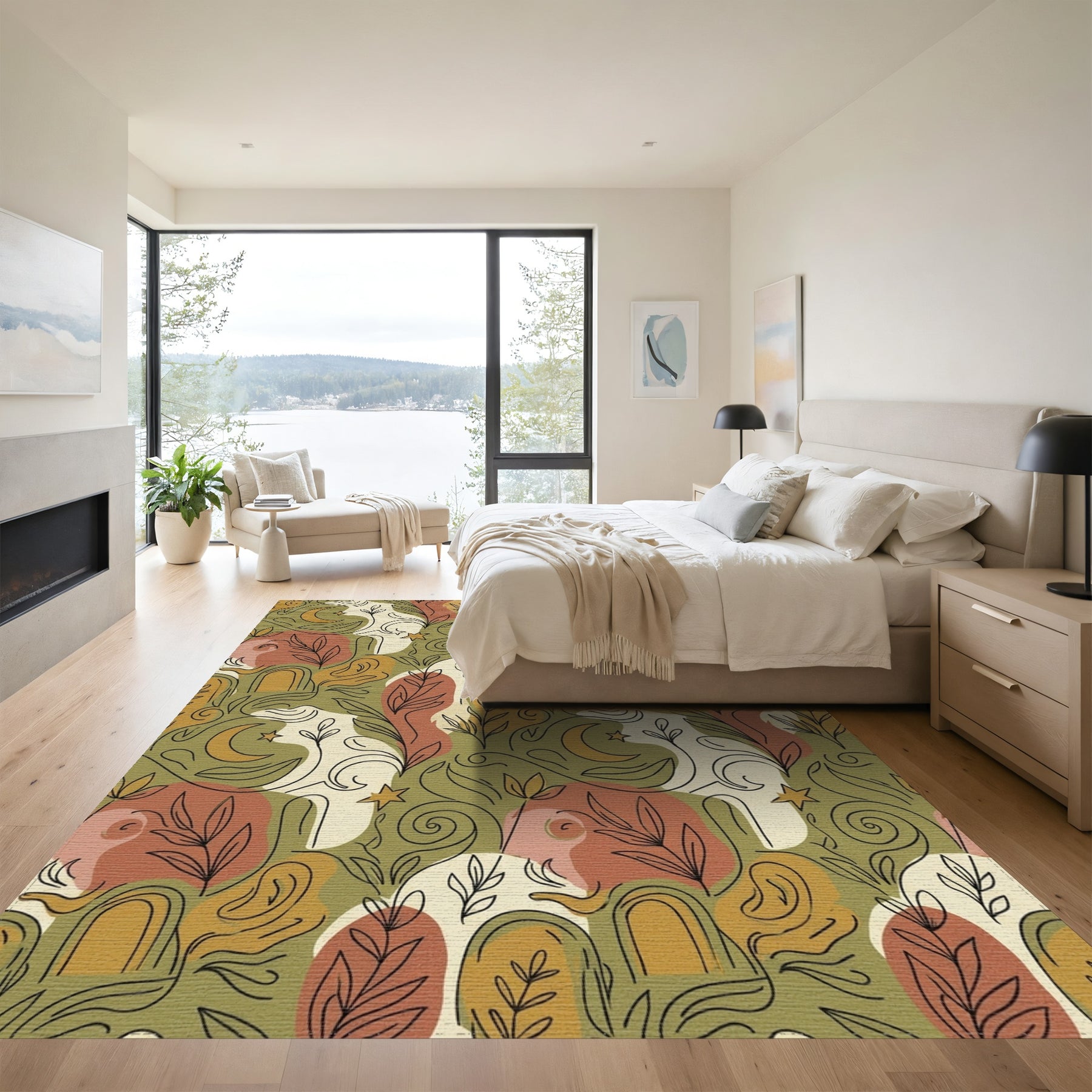 Flatwoven High Traffic Area Rug, Earthy Abstract Celestial Botanical Elements Rug, Non Slip, Stain Resistant, Washable Area Rugs for Living Room, Bedroom Overview: