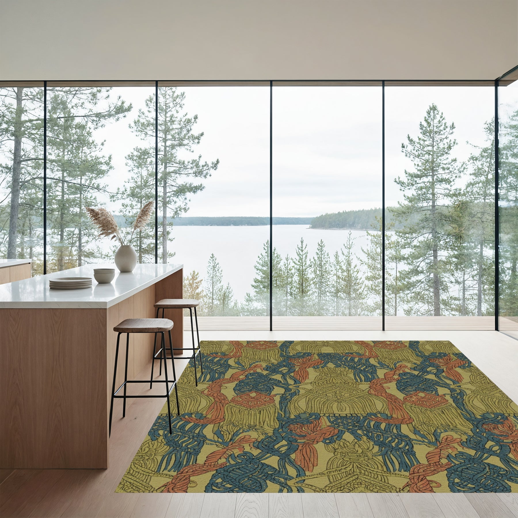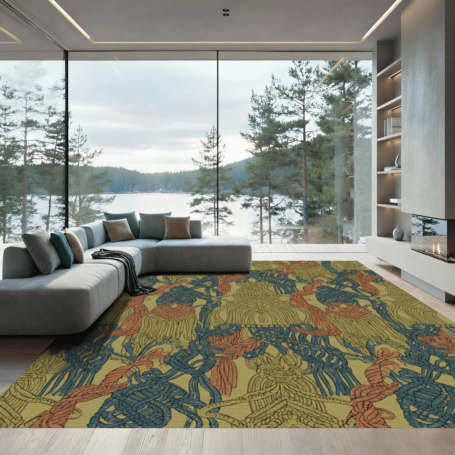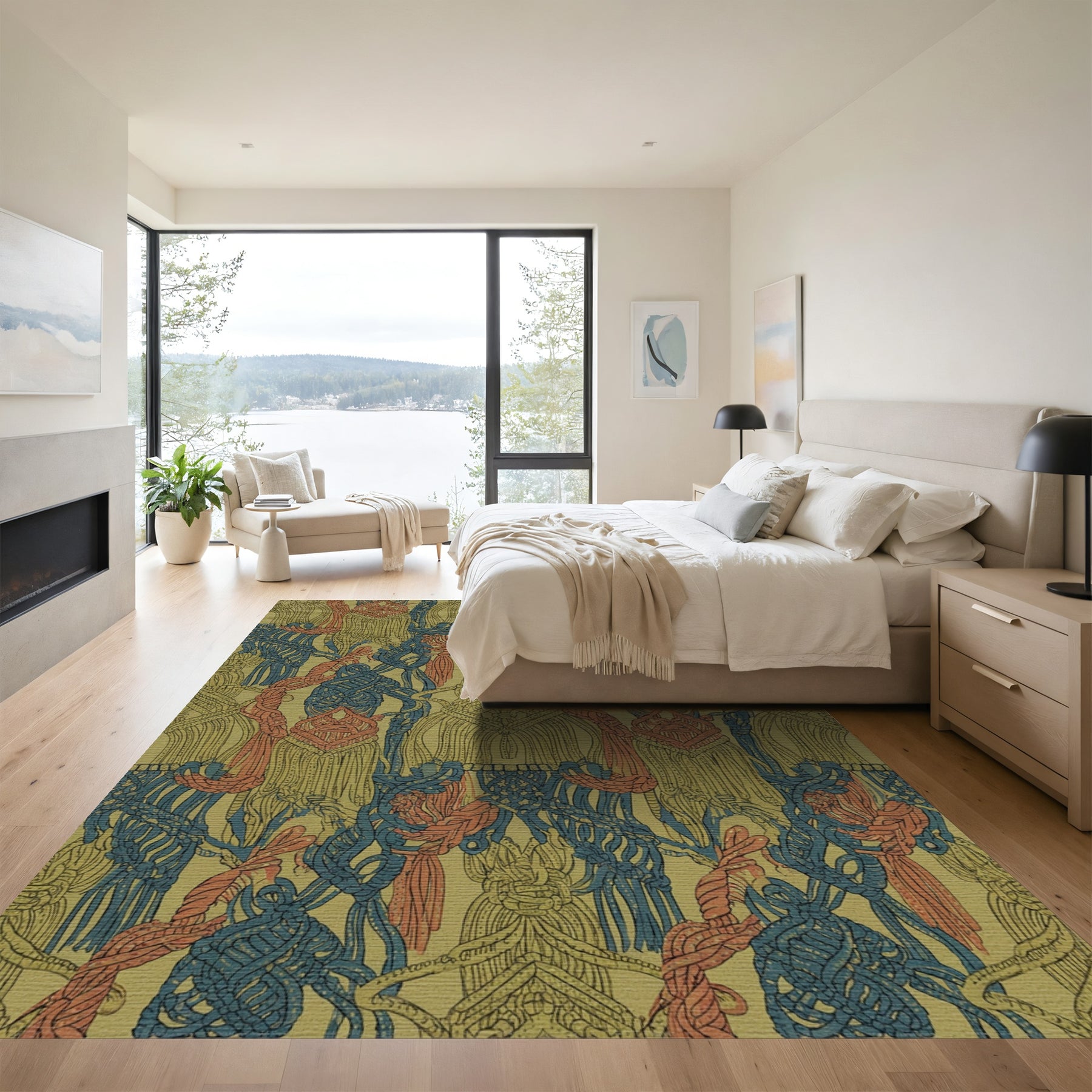 Flatwoven High Traffic Area Rug, Olive Blue Coral Macrame Tassels Rug, Non Slip, Stain Resistant, Washable Area Rugs for Living Room, Bedroom Overview: