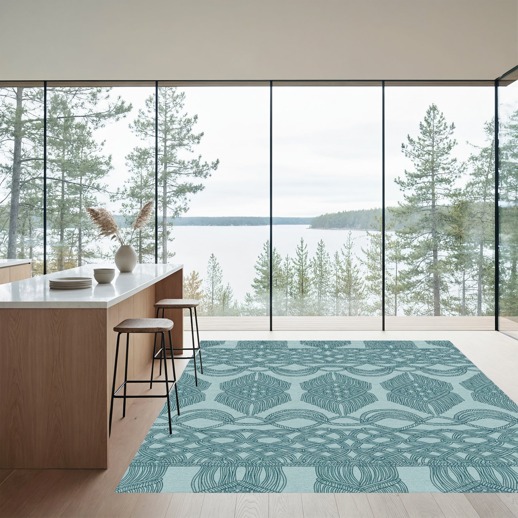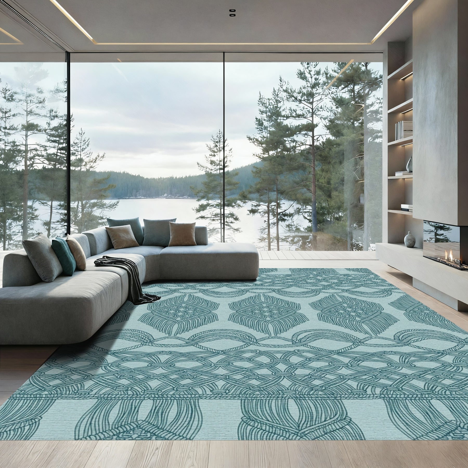 Flatwoven High Traffic Area Rug, Teal Macrame Rope Scroll Rug, Non Slip, Stain Resistant, Washable Area Rugs for Living Room, Bedroom Overview: