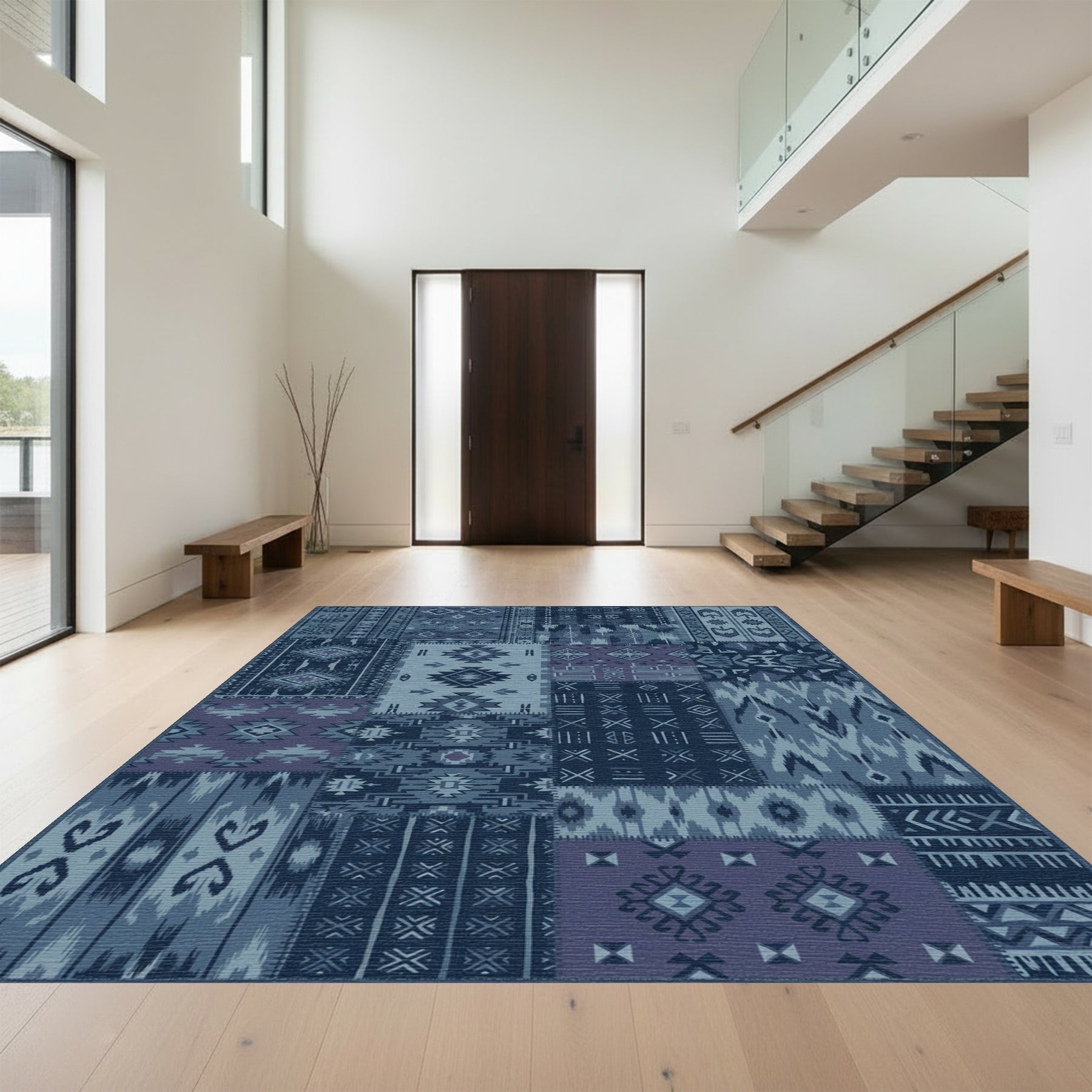 Flatwoven High Traffic Area Rug, Indigo Patchwork Geometric Tribal Rug, Non Slip, Stain Resistant, Washable Area Rugs for Living Room, Bedroom Overview: