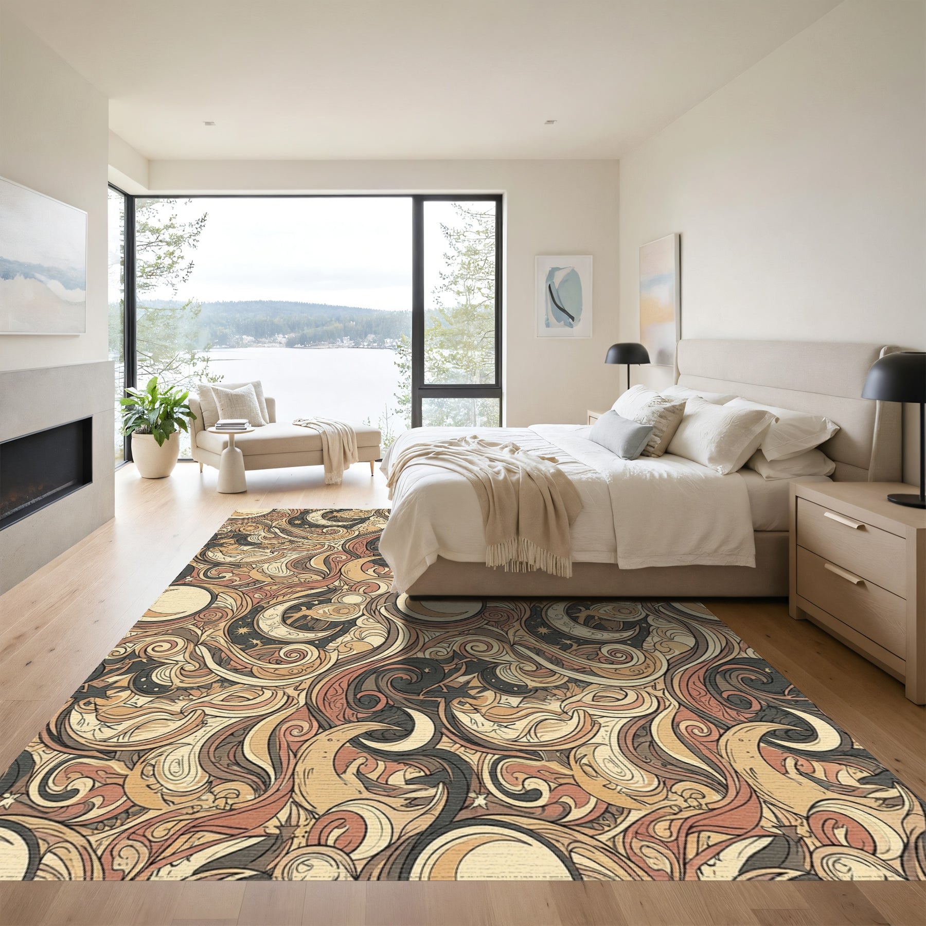 • Modern, artistic: Add a piece of modern charm to your bedroom collection. Designed with the art of minimalism, this rug is sure to provide your bedroom with coziness.