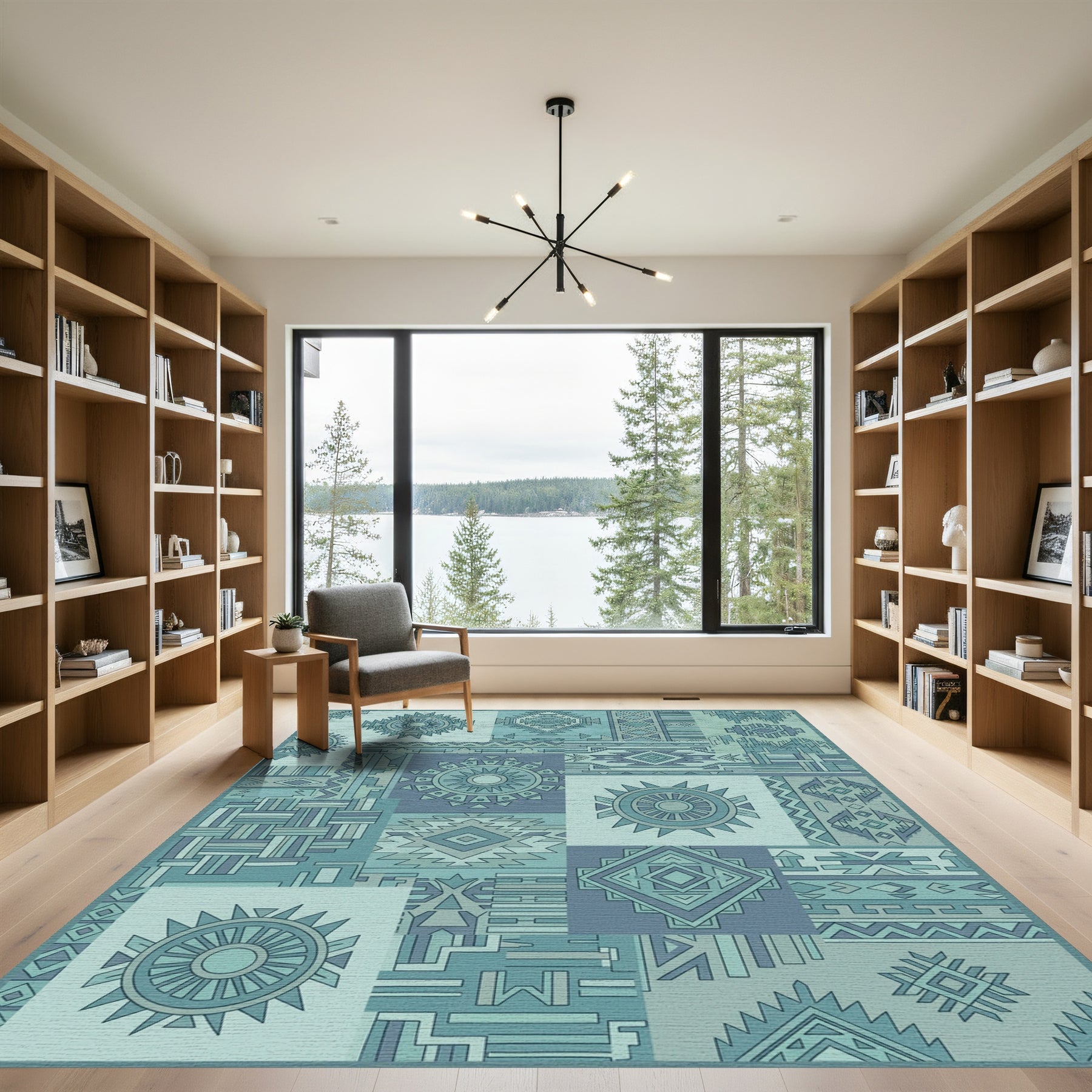 Flatwoven High Traffic Area Rug, Teal Patchwork Geometric Medallion Rug, Non Slip, Stain Resistant, Washable Area Rugs for Living Room, Bedroom Overview: