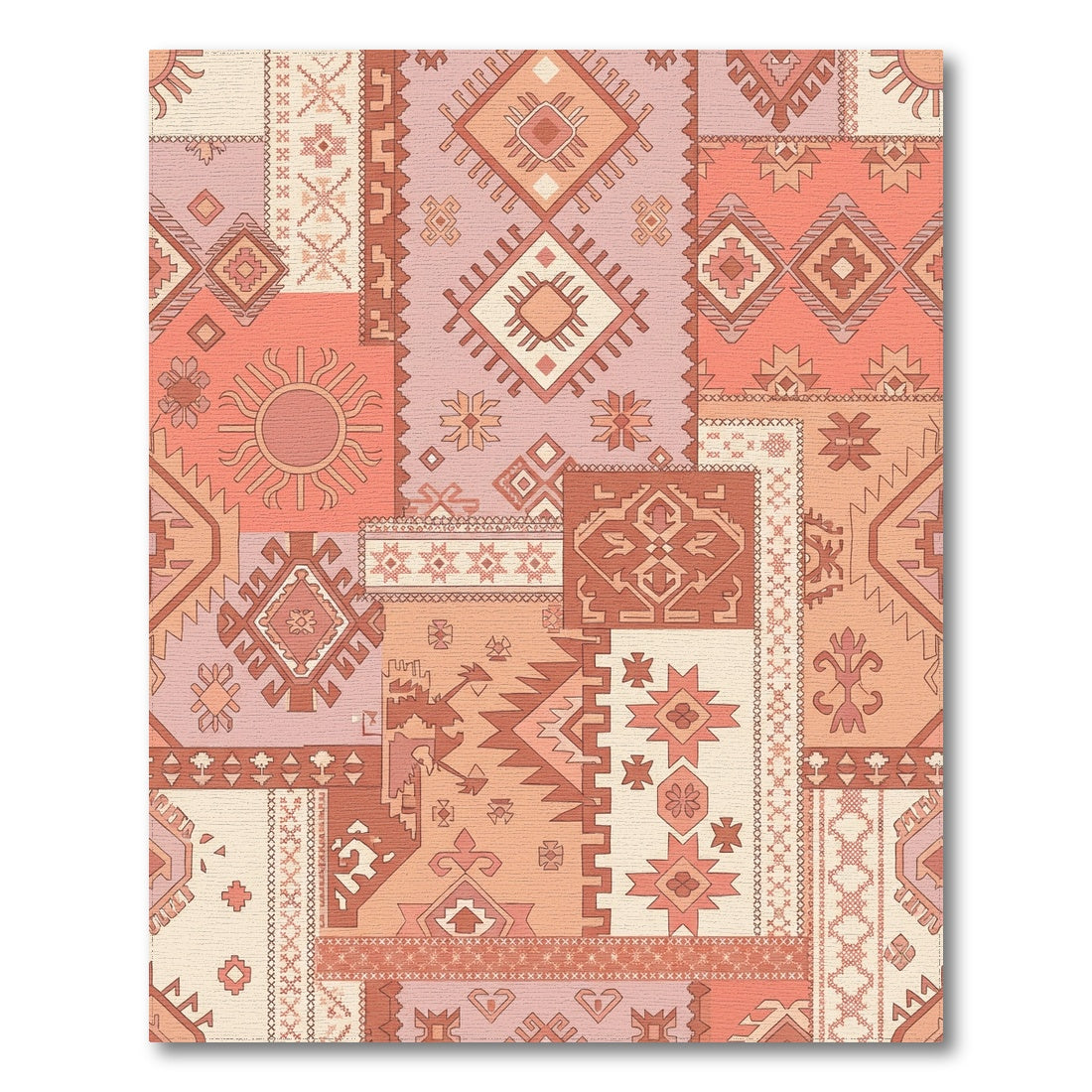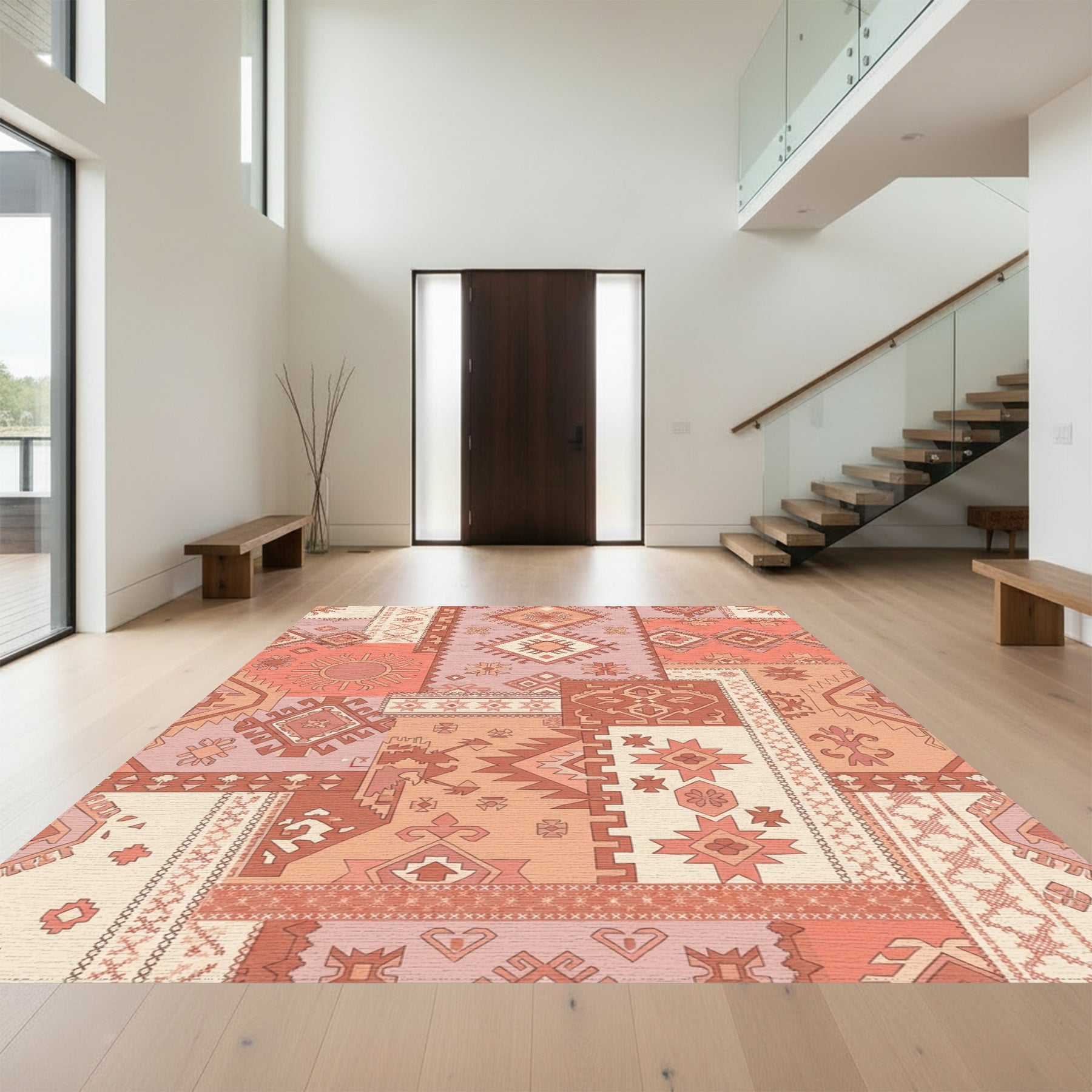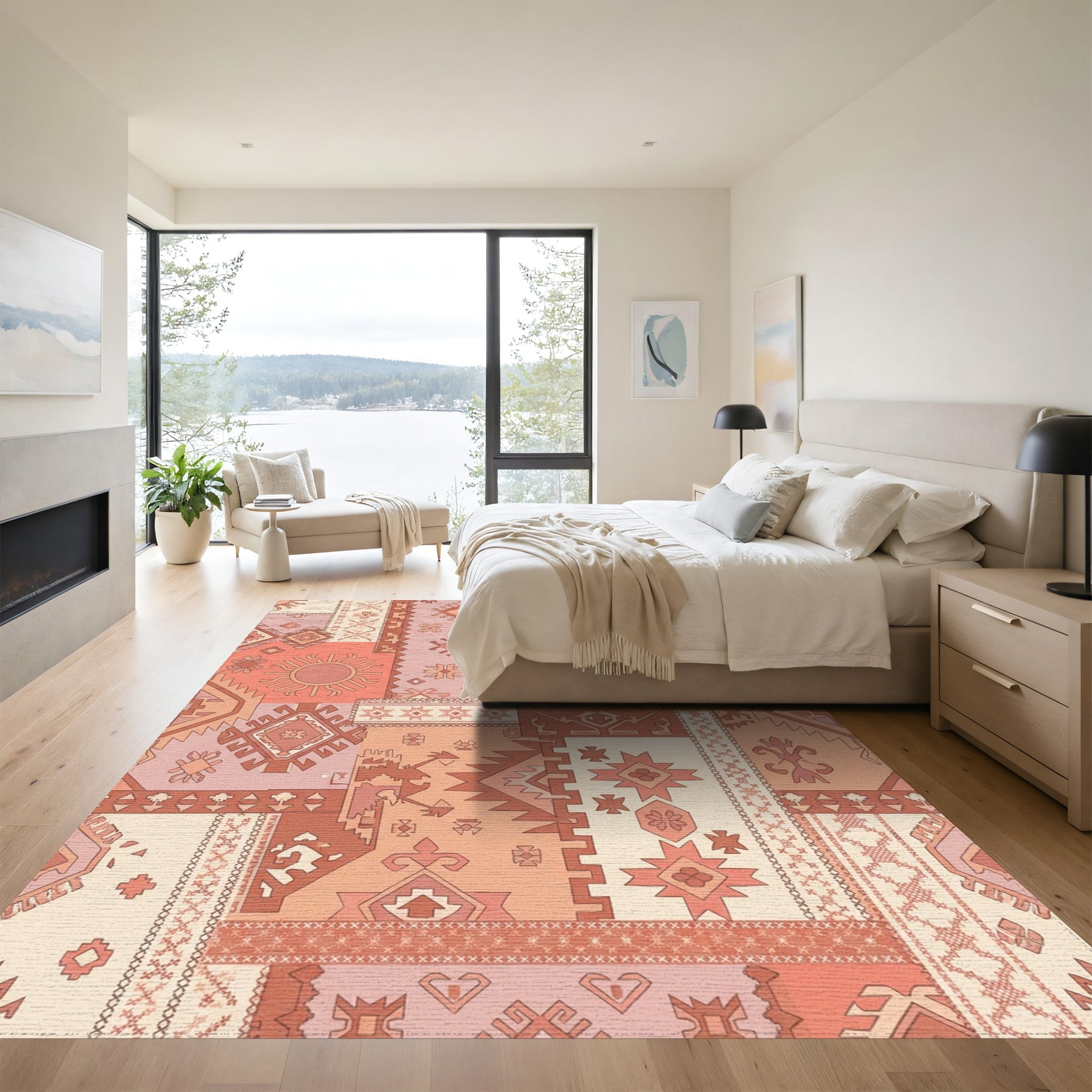 Flatwoven High Traffic Area Rug, Terracotta Coral Patchwork Sunburst Rug, Non Slip, Stain Resistant, Washable Area Rugs for Living Room, Bedroom Overview: