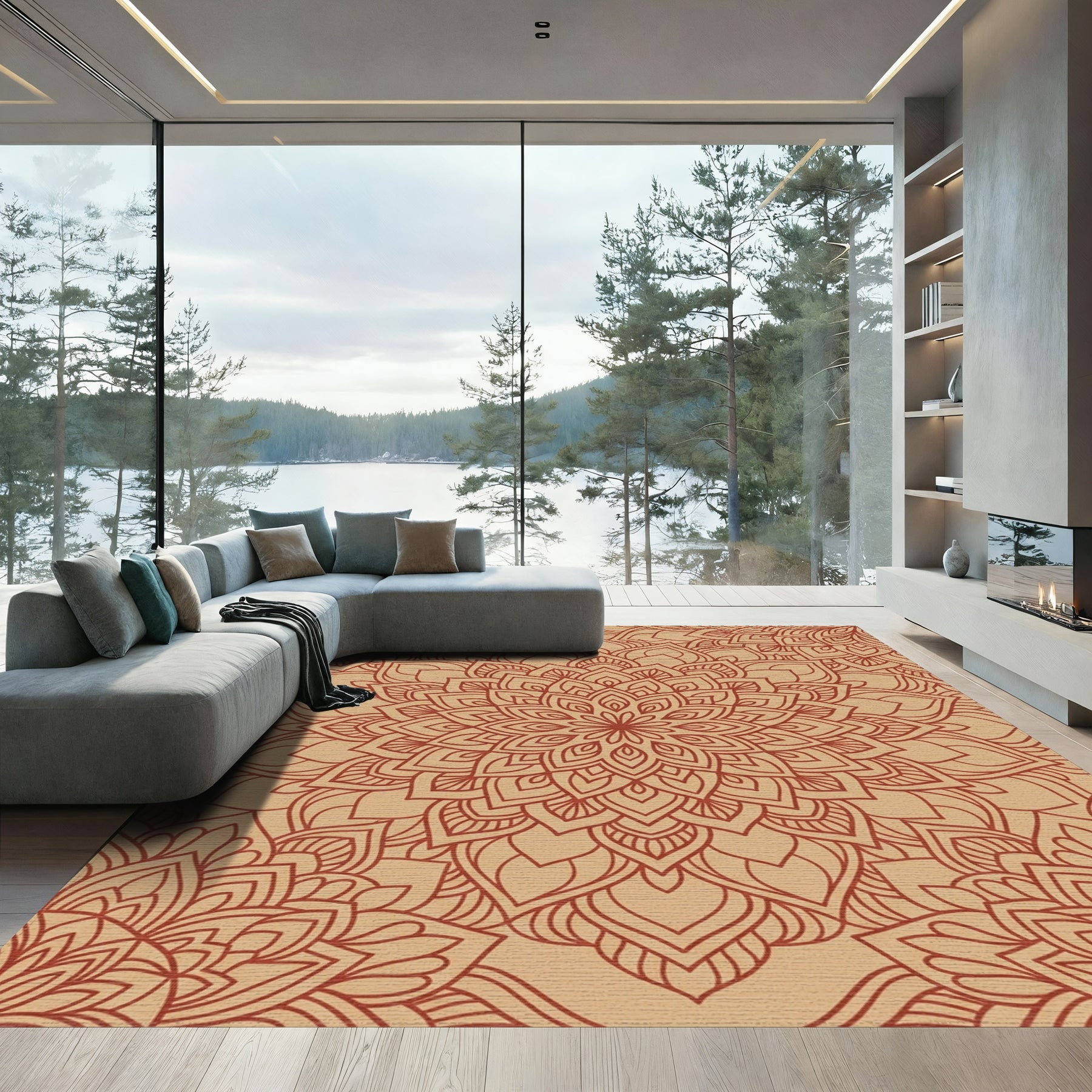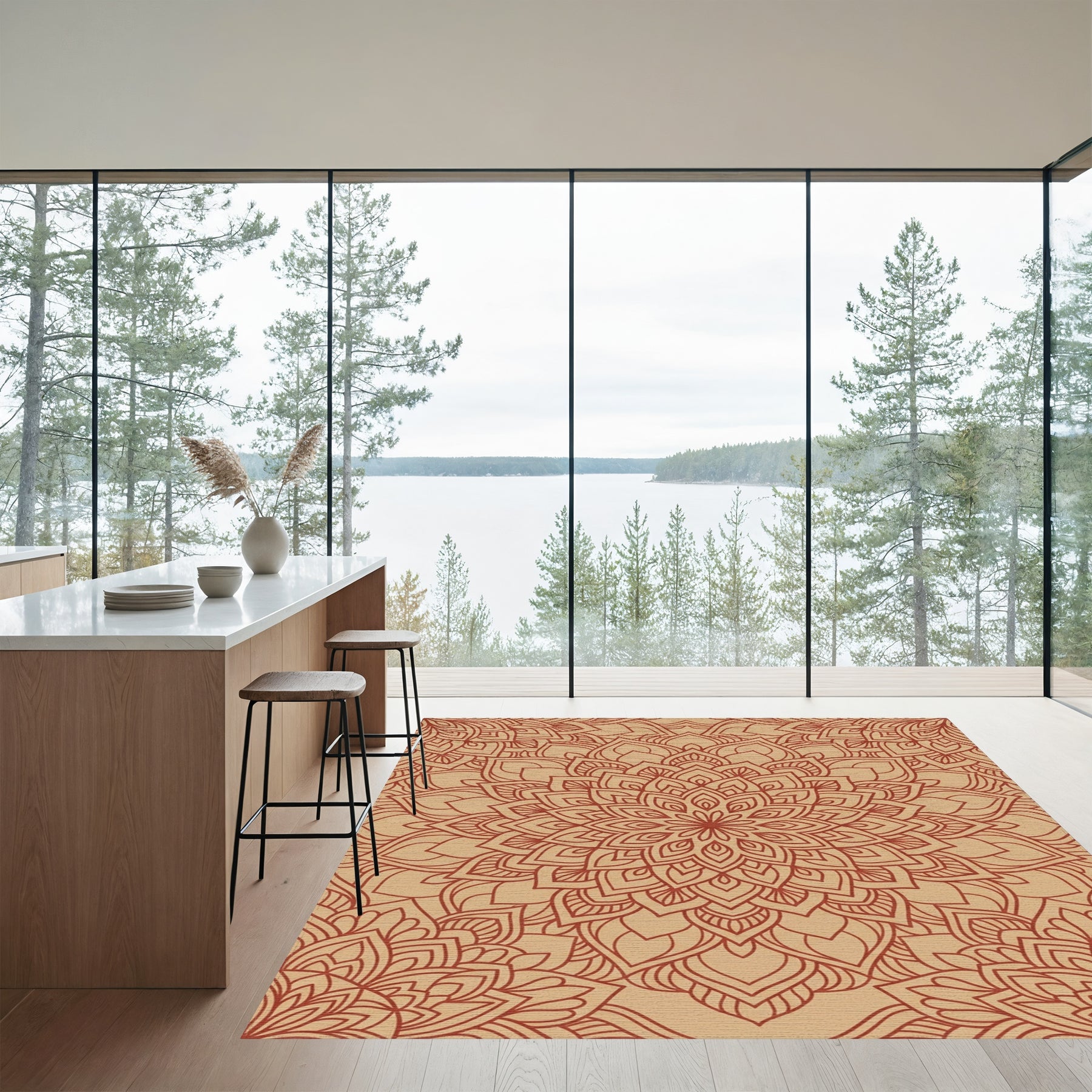 Flatwoven High Traffic Area Rug, Terracotta Floral Mandala Outline Rug, Non Slip, Stain Resistant, Washable Area Rugs for Living Room, Bedroom Overview:
