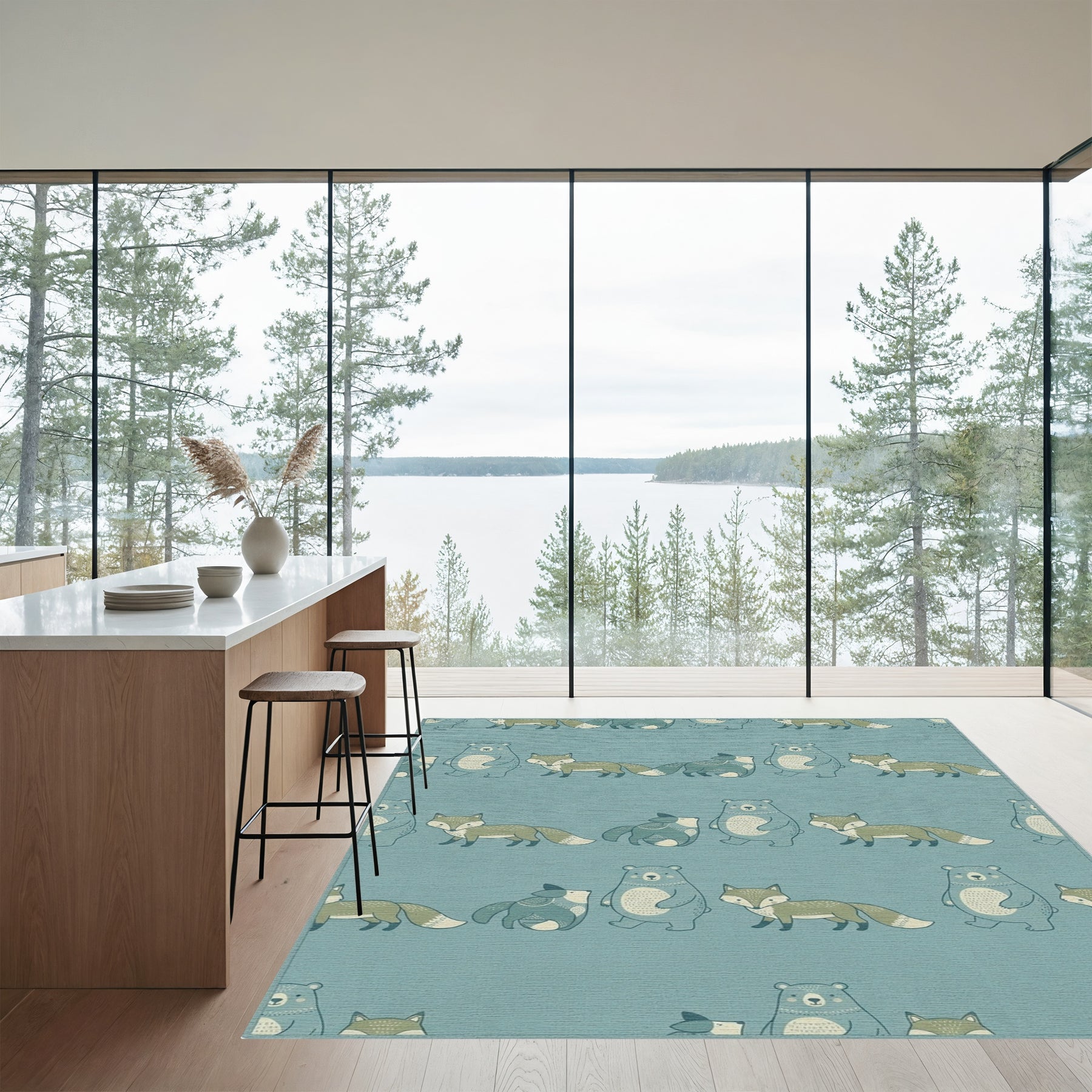 Flatwoven High Traffic Area Rug, Blue Forest Friends Bear Fox Repeat Rug, Non Slip, Stain Resistant, Washable Area Rugs for Living Room, Bedroom Overview: