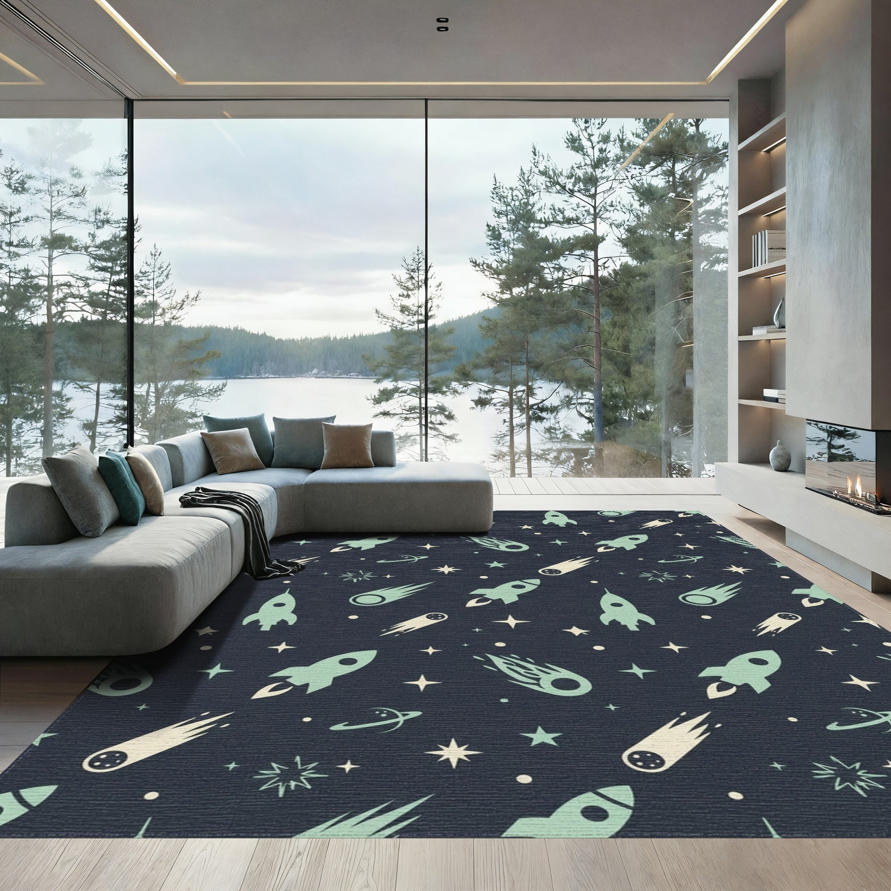 Flatwoven High Traffic Area Rug, Retro Space Rockets Comets Stars Rug, Non Slip, Stain Resistant, Washable Area Rugs for Living Room, Bedroom Overview: