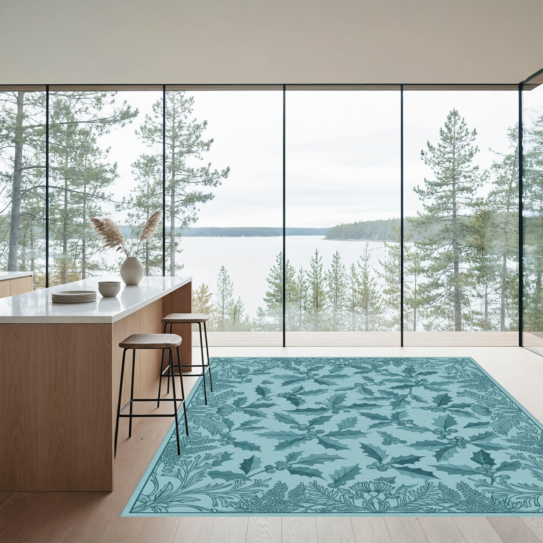Flatwoven High Traffic Area Rug, Teal Holly Berry Floral Border Rug, Non Slip, Stain Resistant, Washable Area Rugs for Living Room, Bedroom Overview: