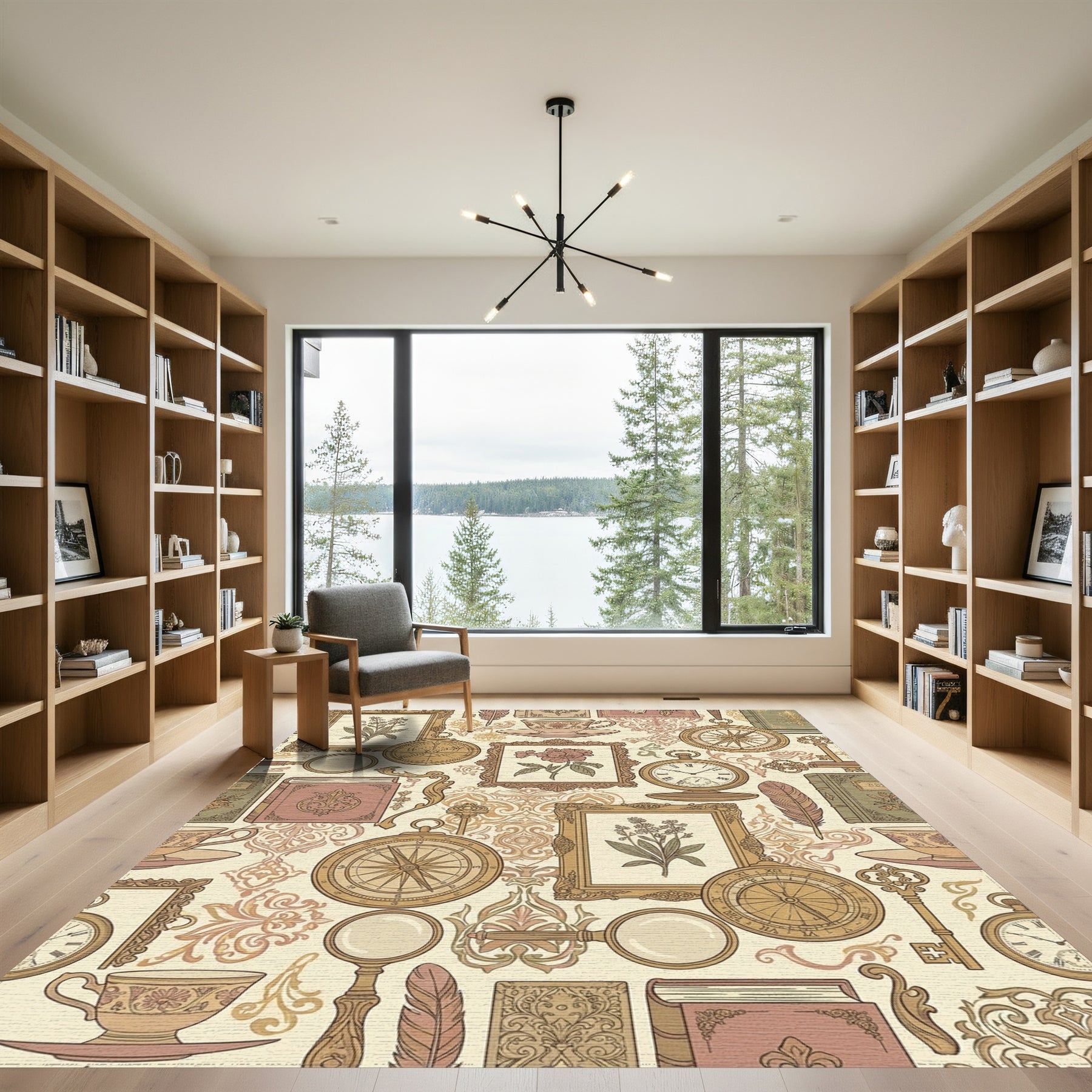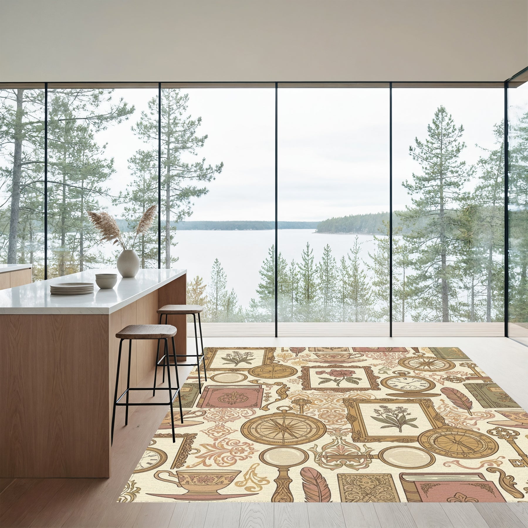 Flatwoven High Traffic Area Rug, Vintage Botanical Tea Cup Compass Art Rug, Non Slip, Stain Resistant, Washable Area Rugs for Living Room, Bedroom Overview: