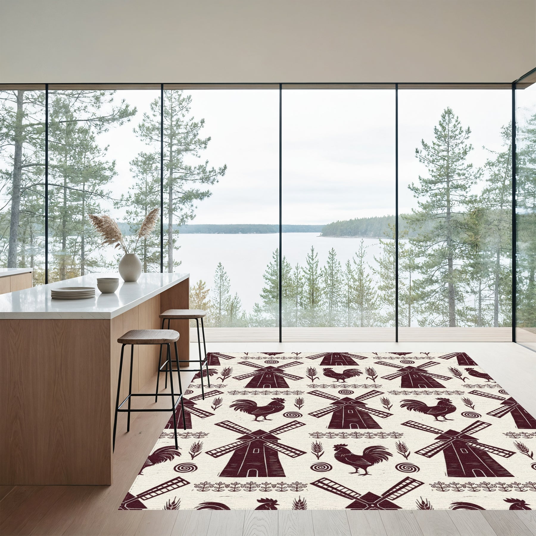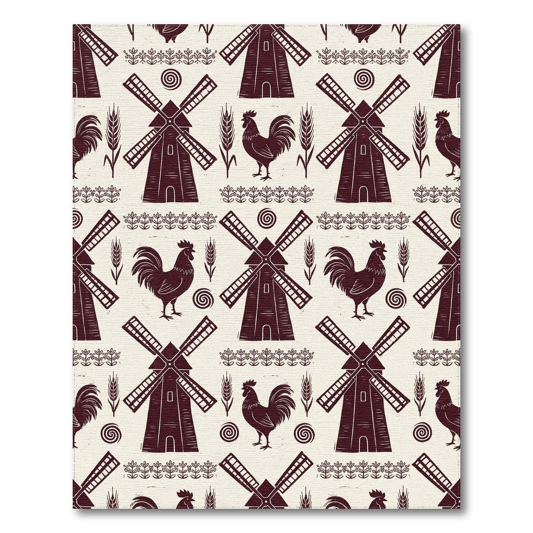 Flatwoven High Traffic Area Rug, Farmhouse Windmill Rooster Wheat Border Rug, Non Slip, Stain Resistant, Washable Area Rugs for Living Room, Bedroom Overview: