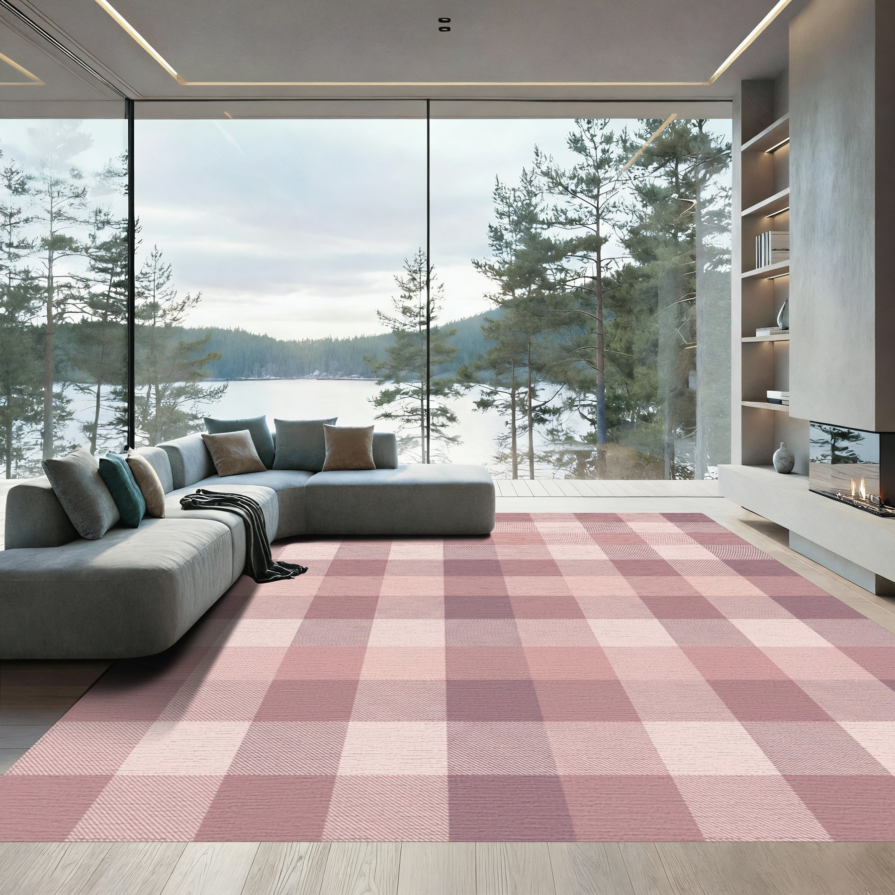 Flatwoven High Traffic Area Rug, Soft Mauve Gingham Plaid Blanket Rug, Non Slip, Stain Resistant, Washable Area Rugs for Living Room, Bedroom Overview: