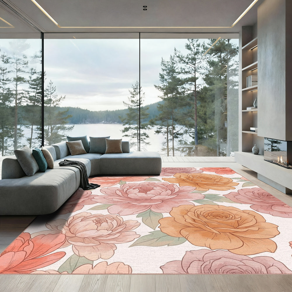 Soft Peach Rose Peony Watercolor Blend Rug
