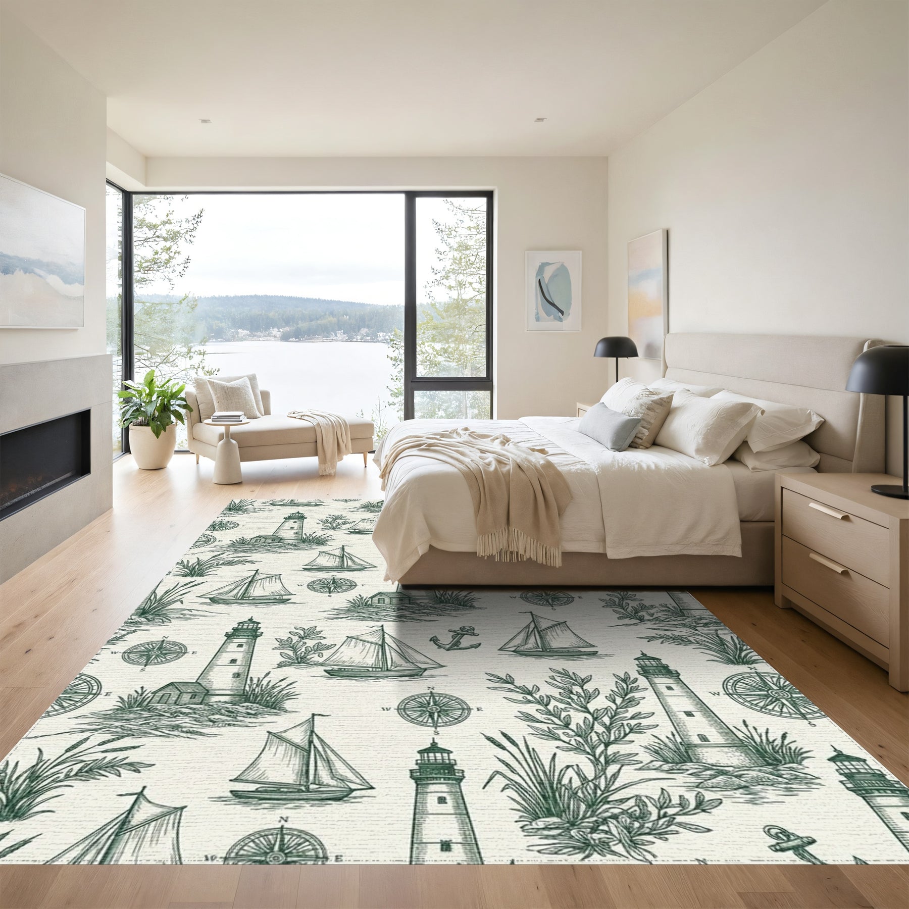 Flatwoven High Traffic Area Rug, Nautical Scene Lighthouses Sailboats Compasses Anchor Rug, Non Slip, Stain Resistant, Washable Area Rugs for Living Room, Bedroom Overview: