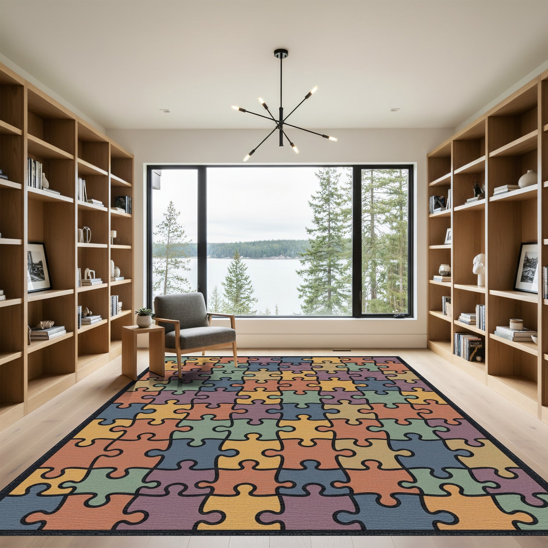 Flatwoven High Traffic Area Rug, Colorful Puzzle Pieces Square Rug, Non Slip, Stain Resistant, Washable Area Rugs for Living Room, Bedroom Overview: