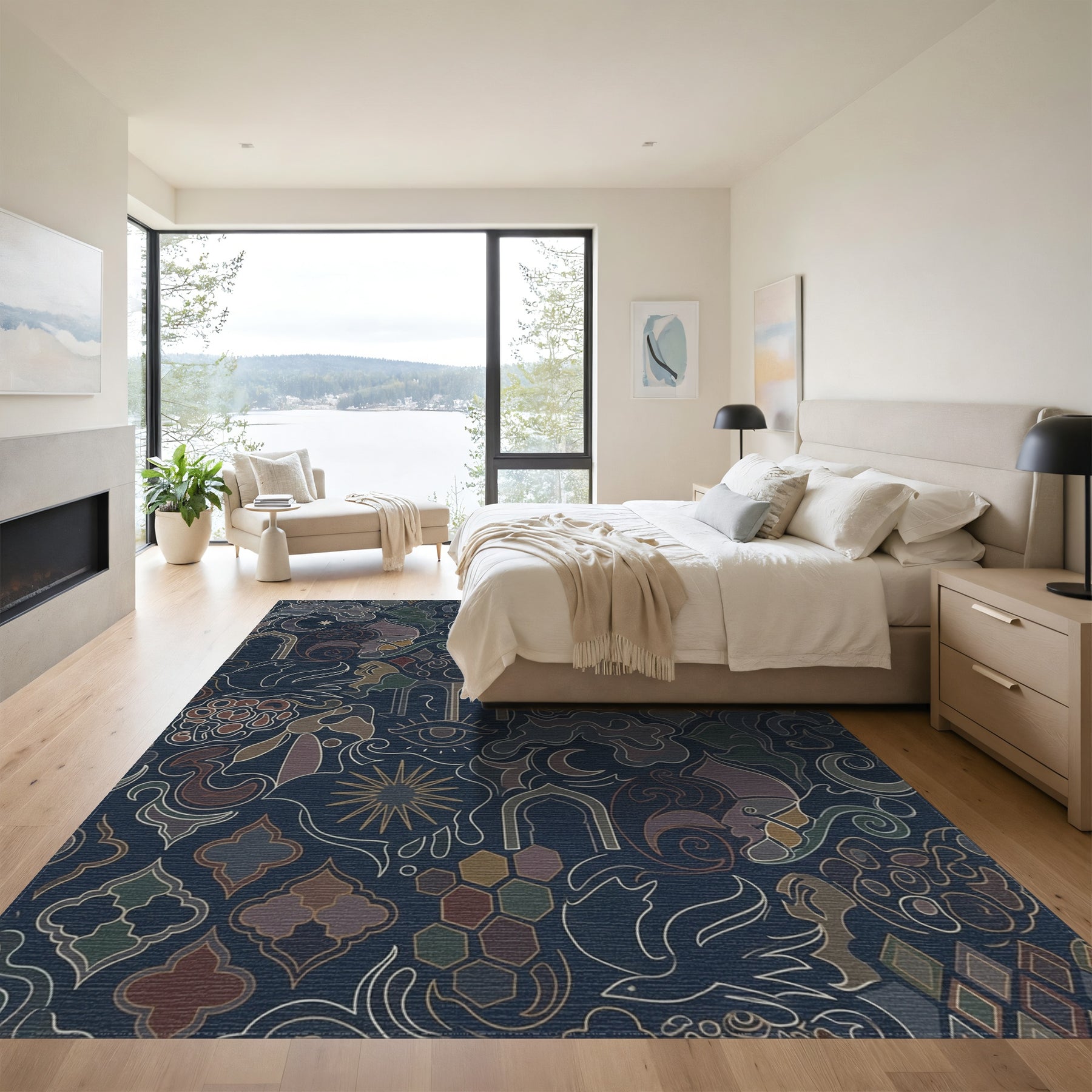 Flatwoven High Traffic Area Rug, Dark Blue Mystical Arc Symbols Rug, Non Slip, Stain Resistant, Washable Area Rugs for Living Room, Bedroom Overview: