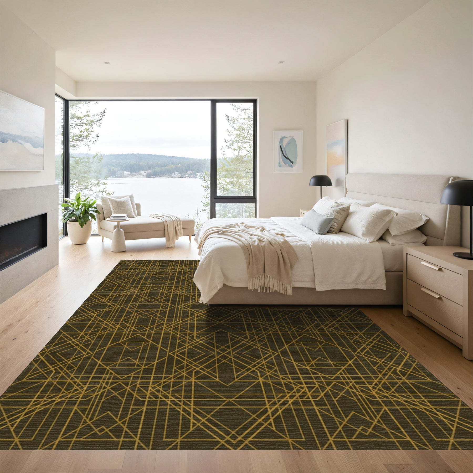 Flatwoven High Traffic Area Rug, Gold Geometric Art Deco Lines Rug, Non Slip, Stain Resistant, Washable Area Rugs for Living Room, Bedroom Overview: