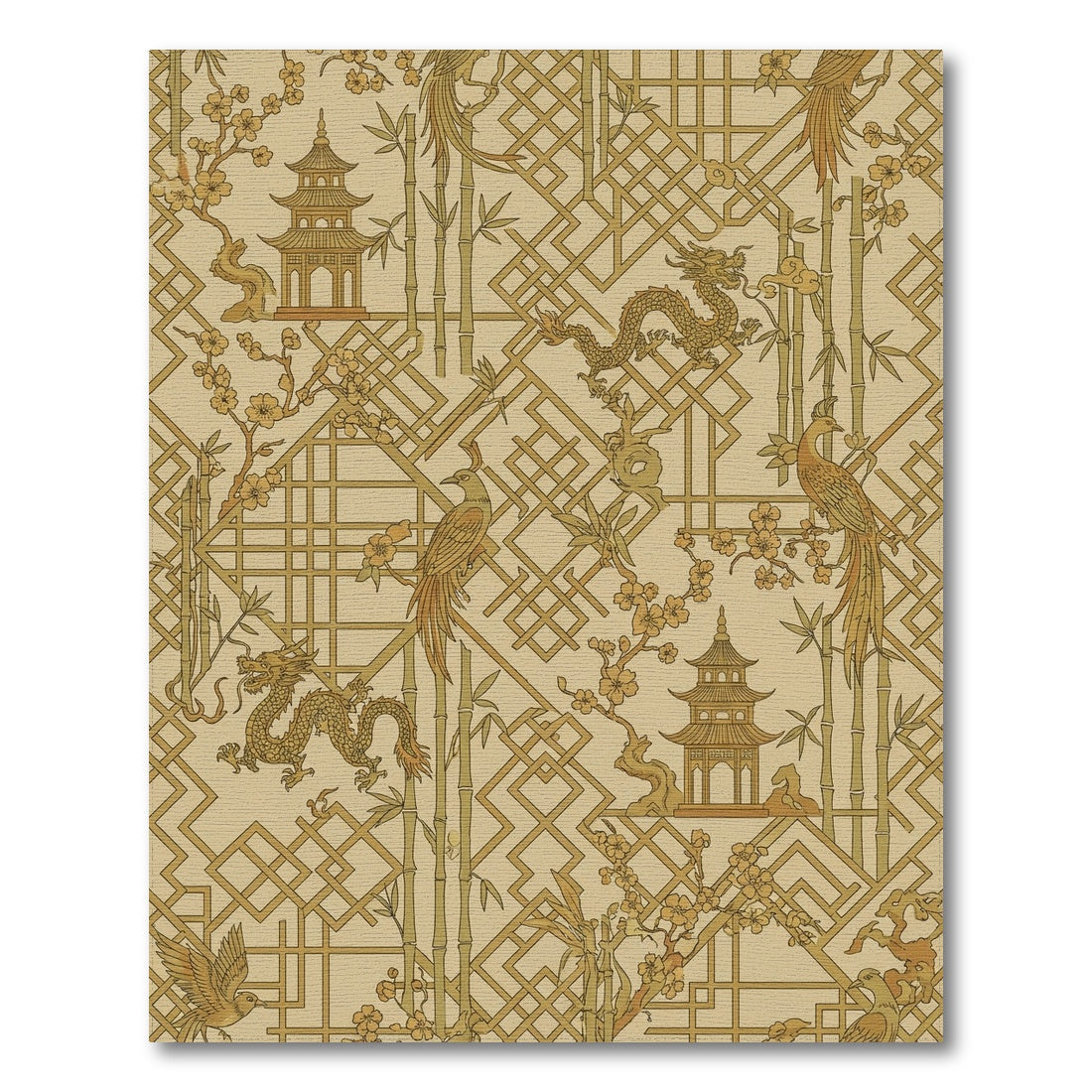 Flatwoven High Traffic Area Rug, Golden Dragon Pagoda Bamboo Birds Rug, Non Slip, Stain Resistant, Washable Area Rugs for Living Room, Bedroom Overview: