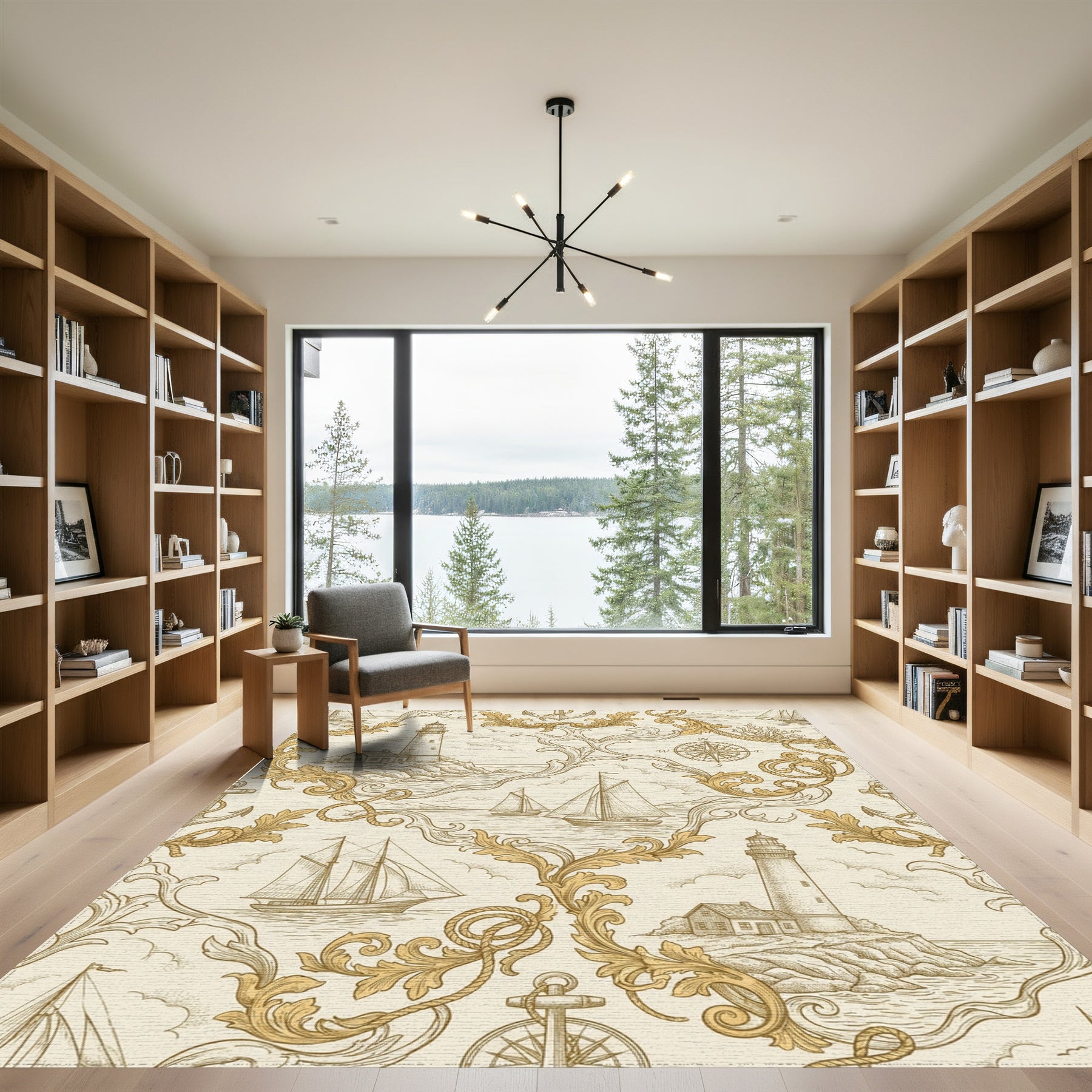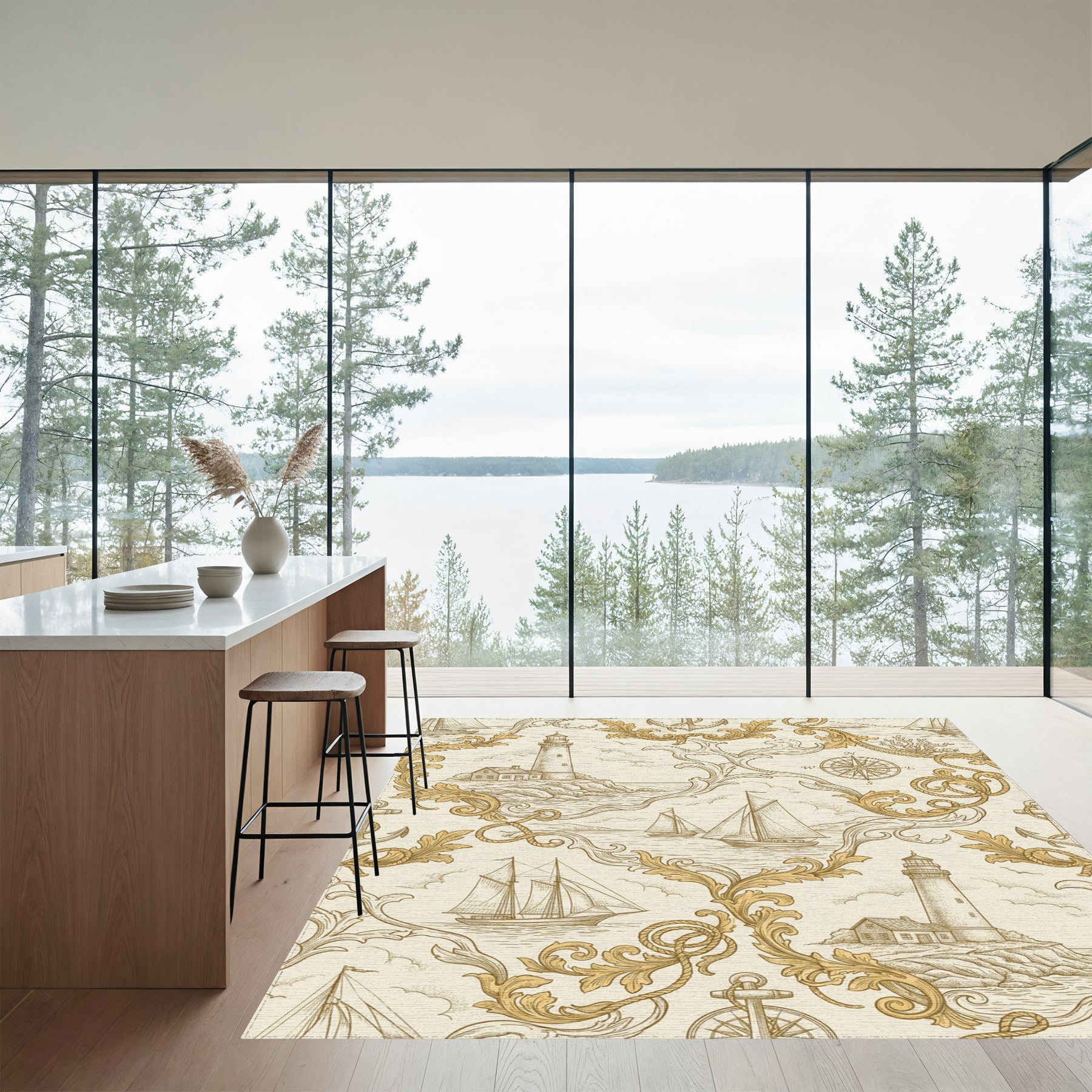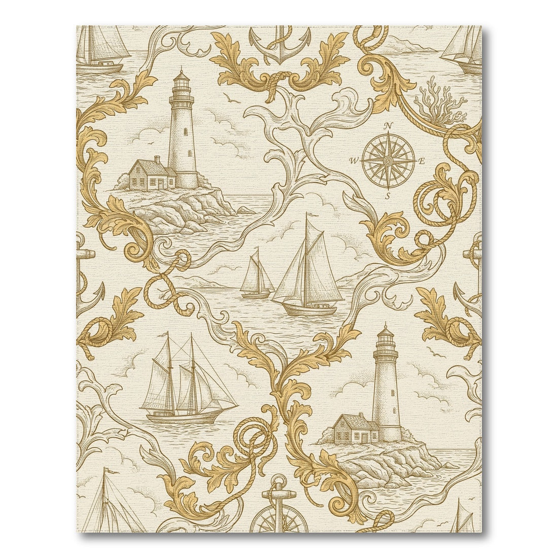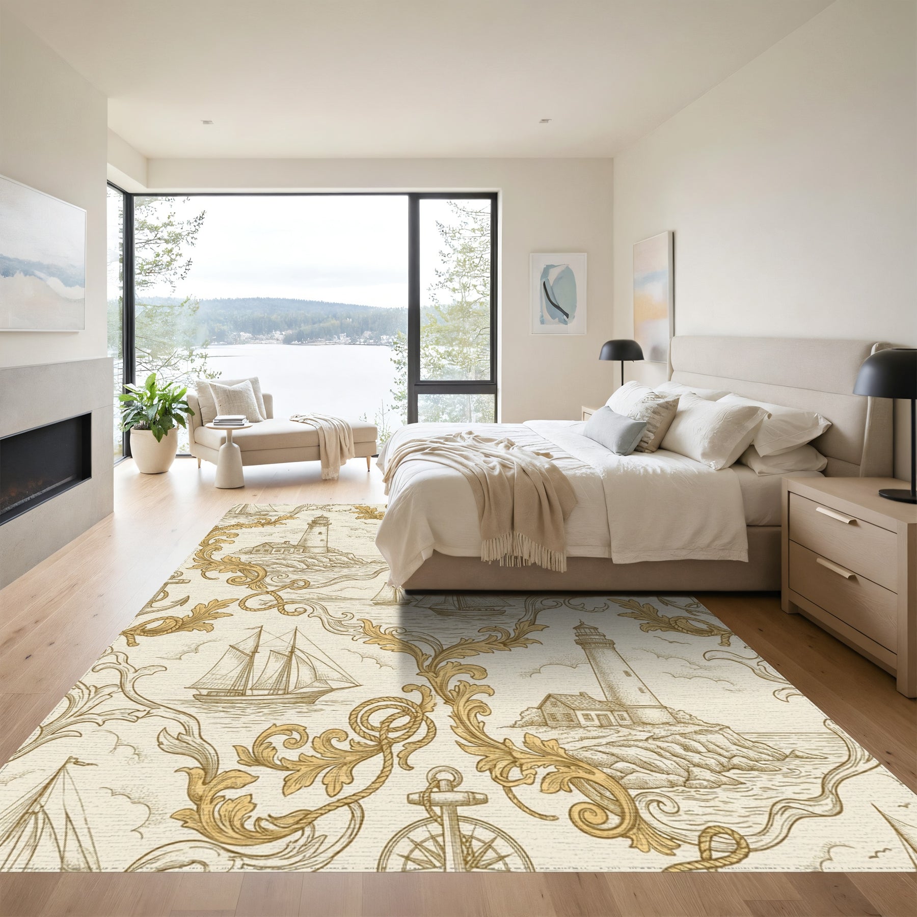 Nautical Sailboat Lighthouse Compass Scroll Rug