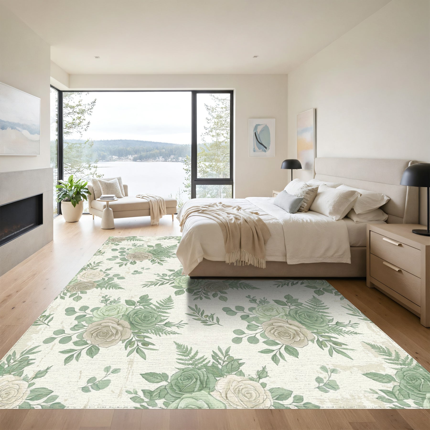 Flatwoven High Traffic Area Rug, Soft Green Rose Blossom Foliage Arrangement Rug, Non Slip, Stain Resistant, Washable Area Rugs for Living Room, Bedroom Overview: