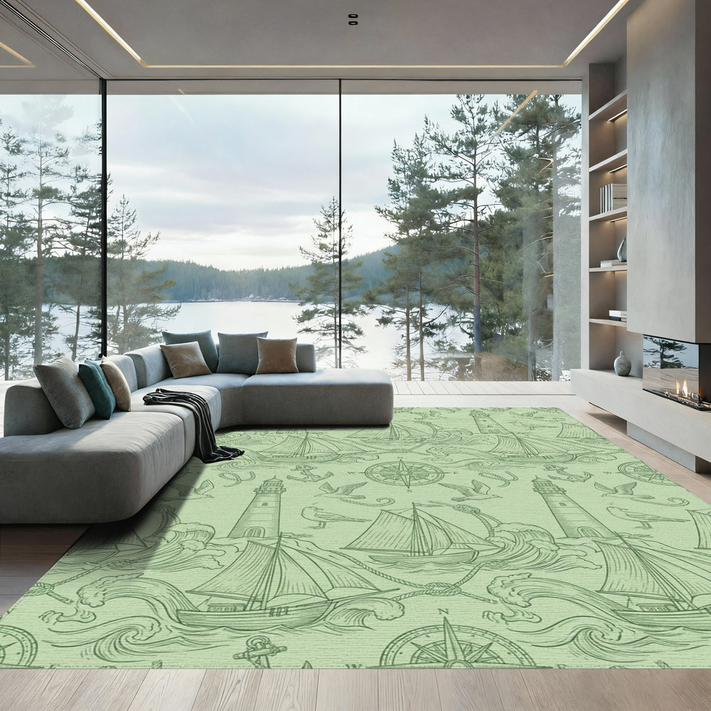 Coastal Nautical Lighthouse Sailboat Seagull Compass Rug