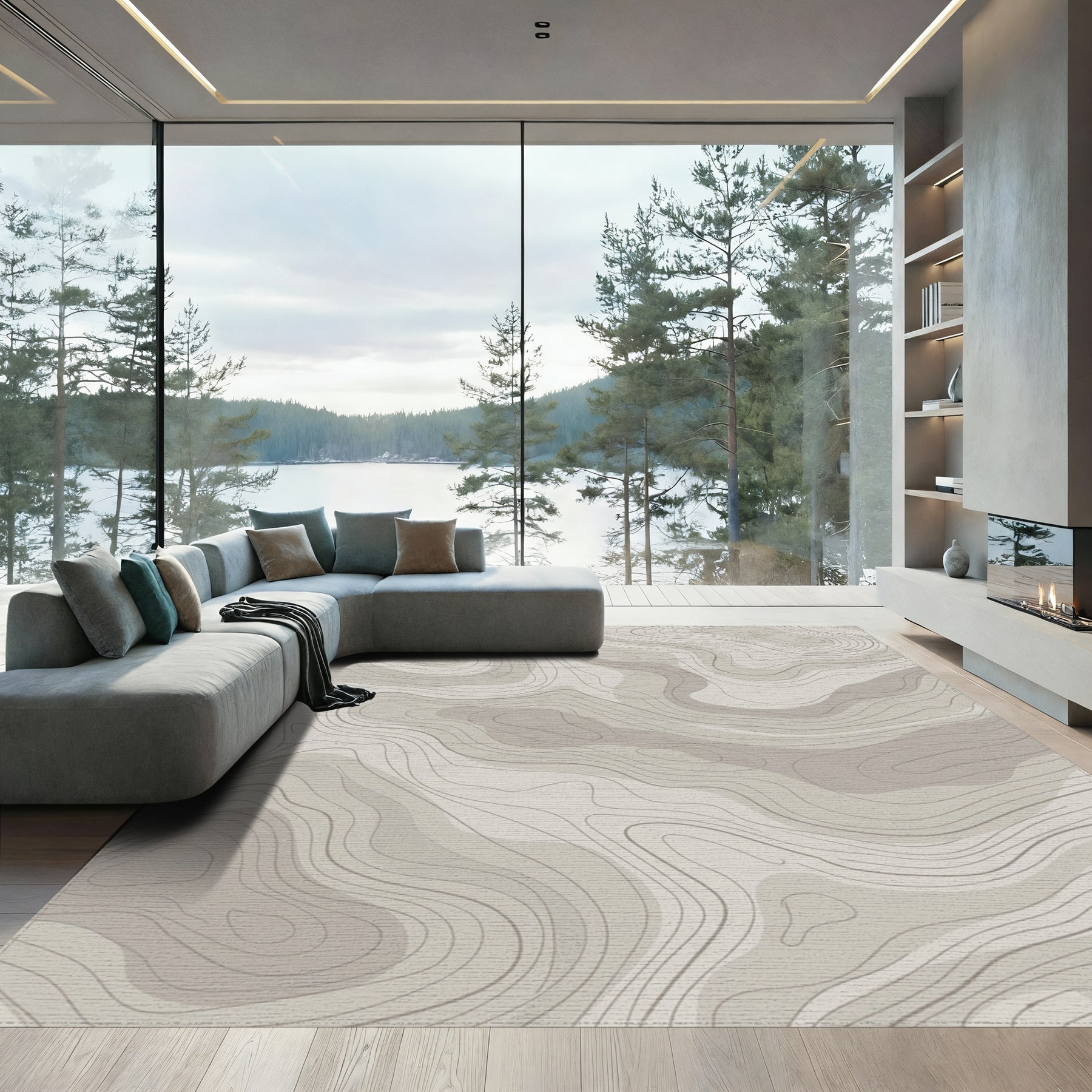 Flatwoven High Traffic Area Rug, Beige Topographic Contour Lines Rug, Non Slip, Stain Resistant, Washable Area Rugs for Living Room, Bedroom Overview: