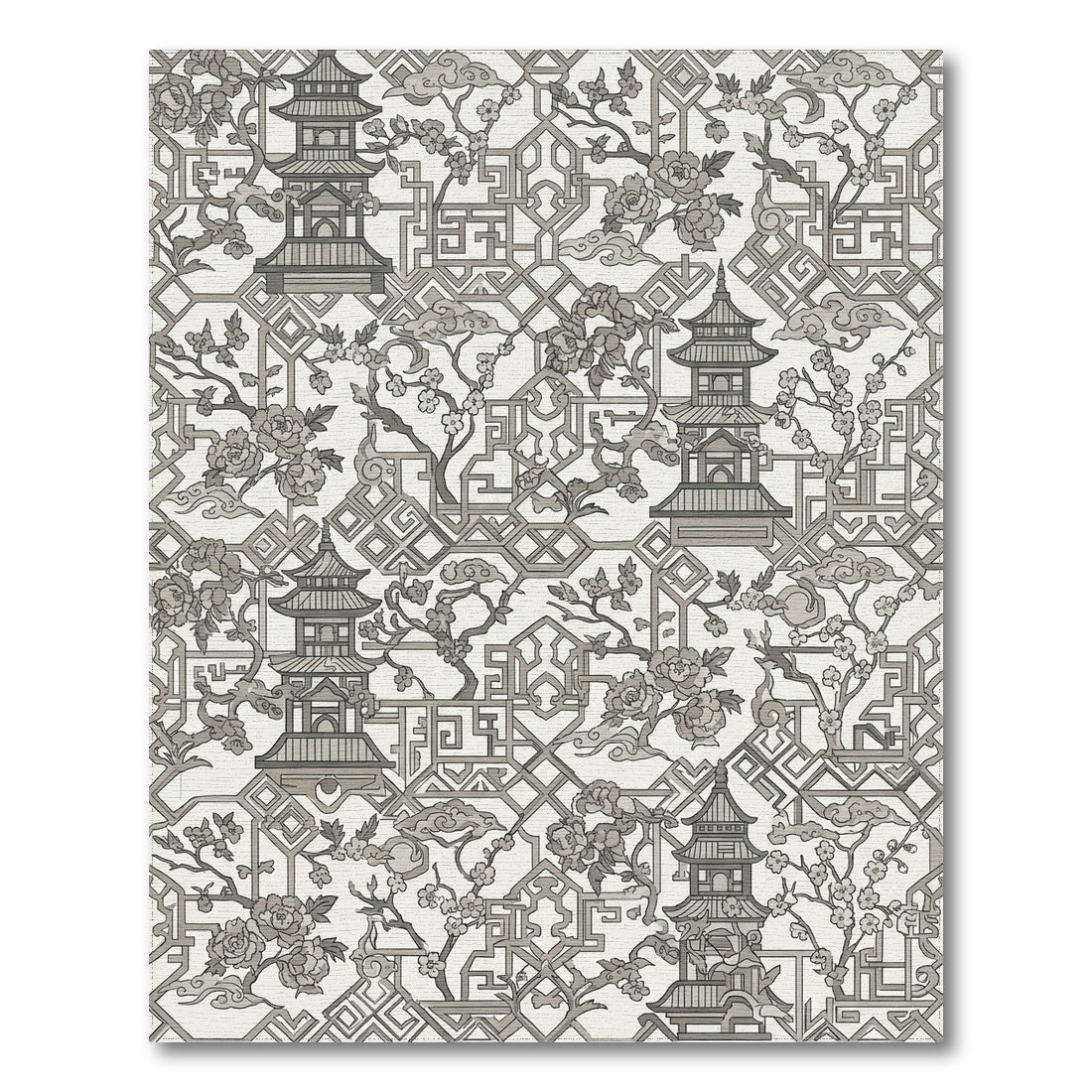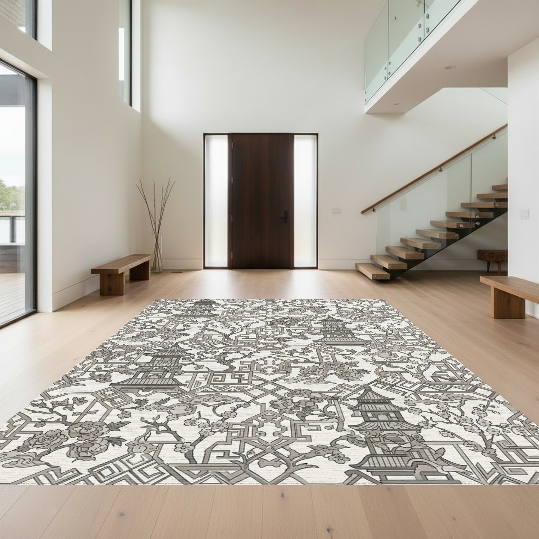 Flatwoven High Traffic Area Rug, Gray Pagoda Floral Lattice Scene Rug, Non Slip, Stain Resistant, Washable Area Rugs for Living Room, Bedroom Overview: