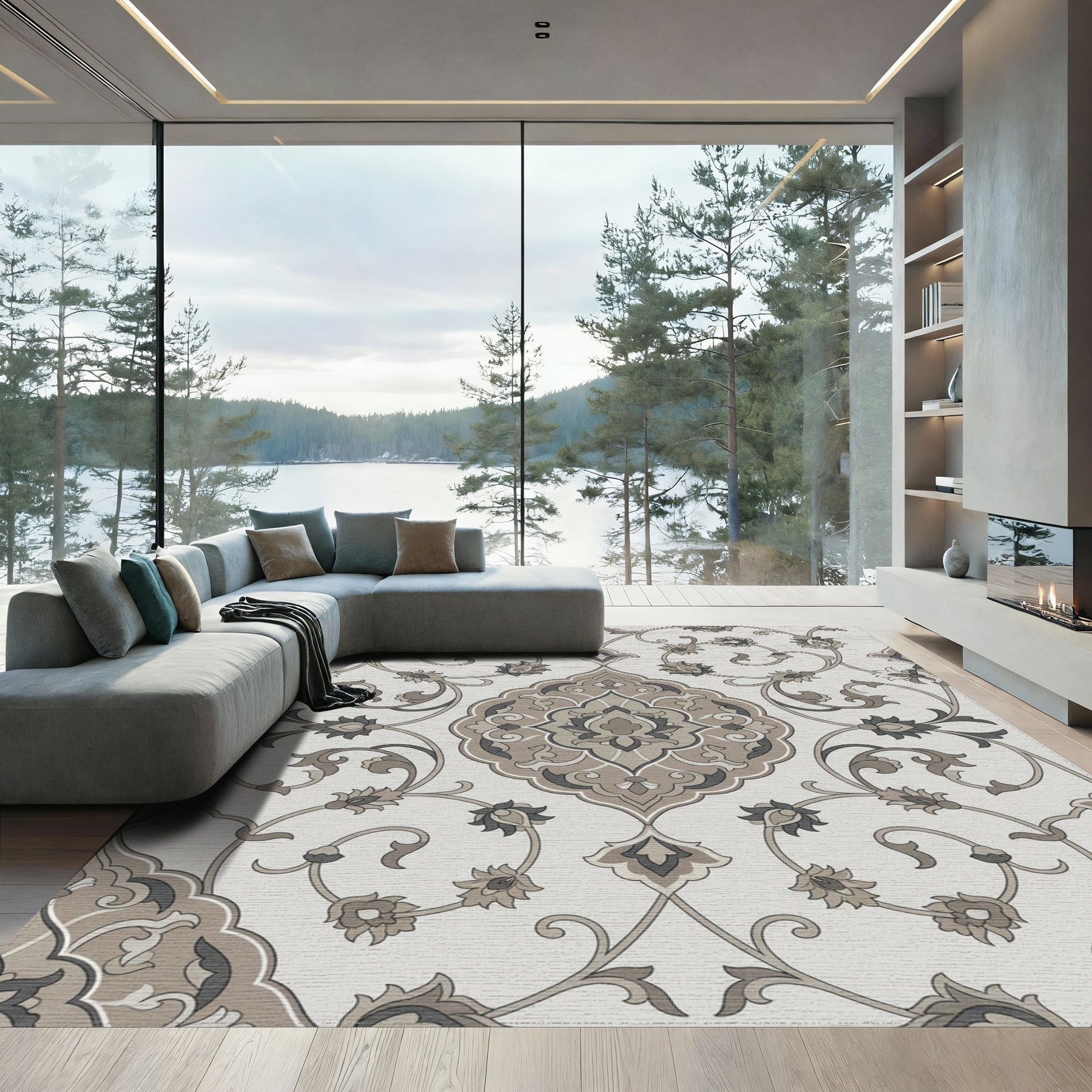 Flatwoven High Traffic Area Rug, Neutral Ochre Floral Arabesque Rug, Non Slip, Stain Resistant, Washable Area Rugs for Living Room, Bedroom Overview: