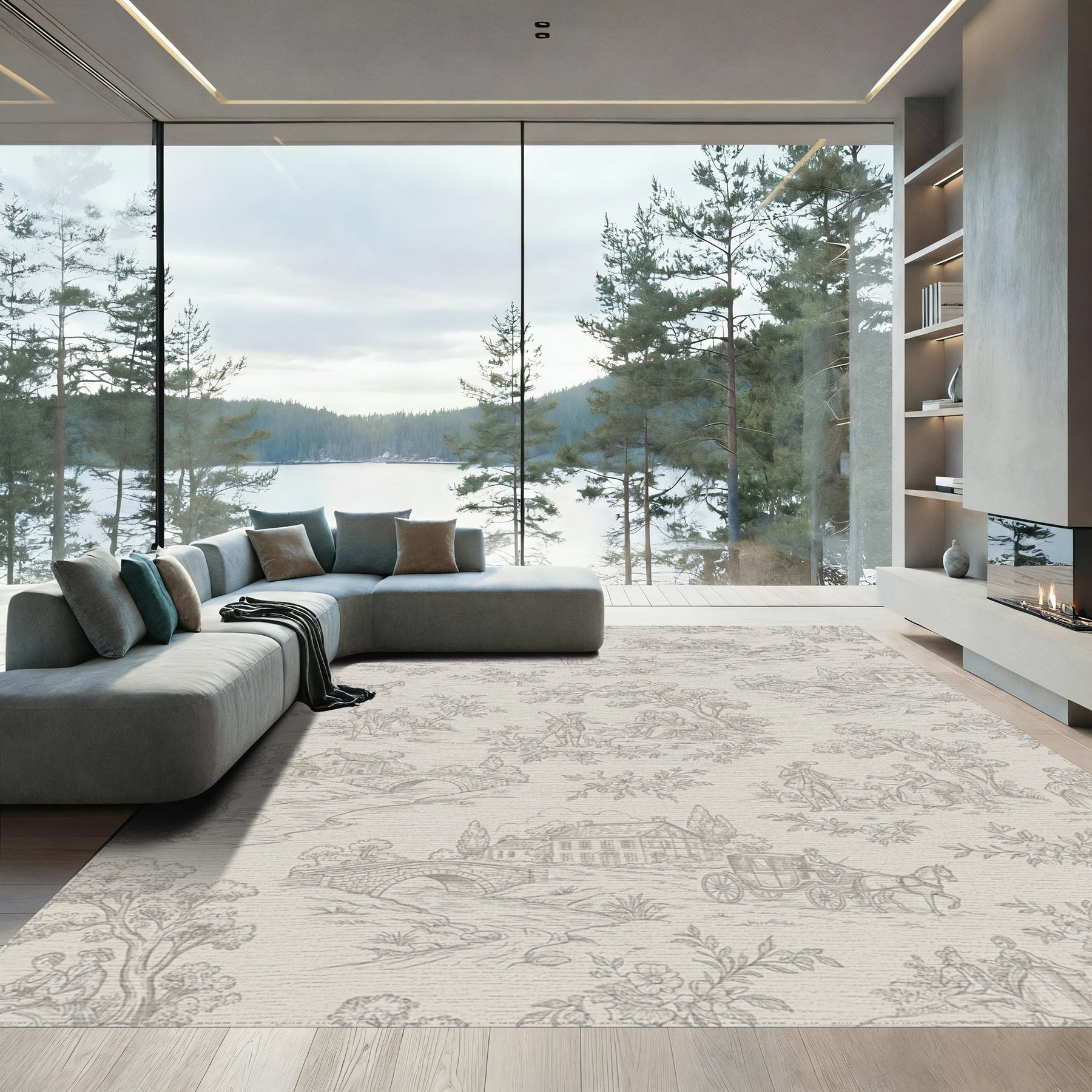 Flatwoven High Traffic Area Rug, Pastoral Landscape Scenes Beige Grey Rug, Non Slip, Stain Resistant, Washable Area Rugs for Living Room, Bedroom Overview: