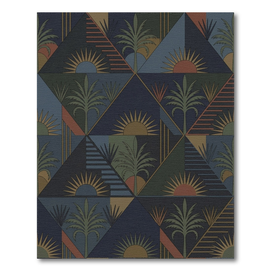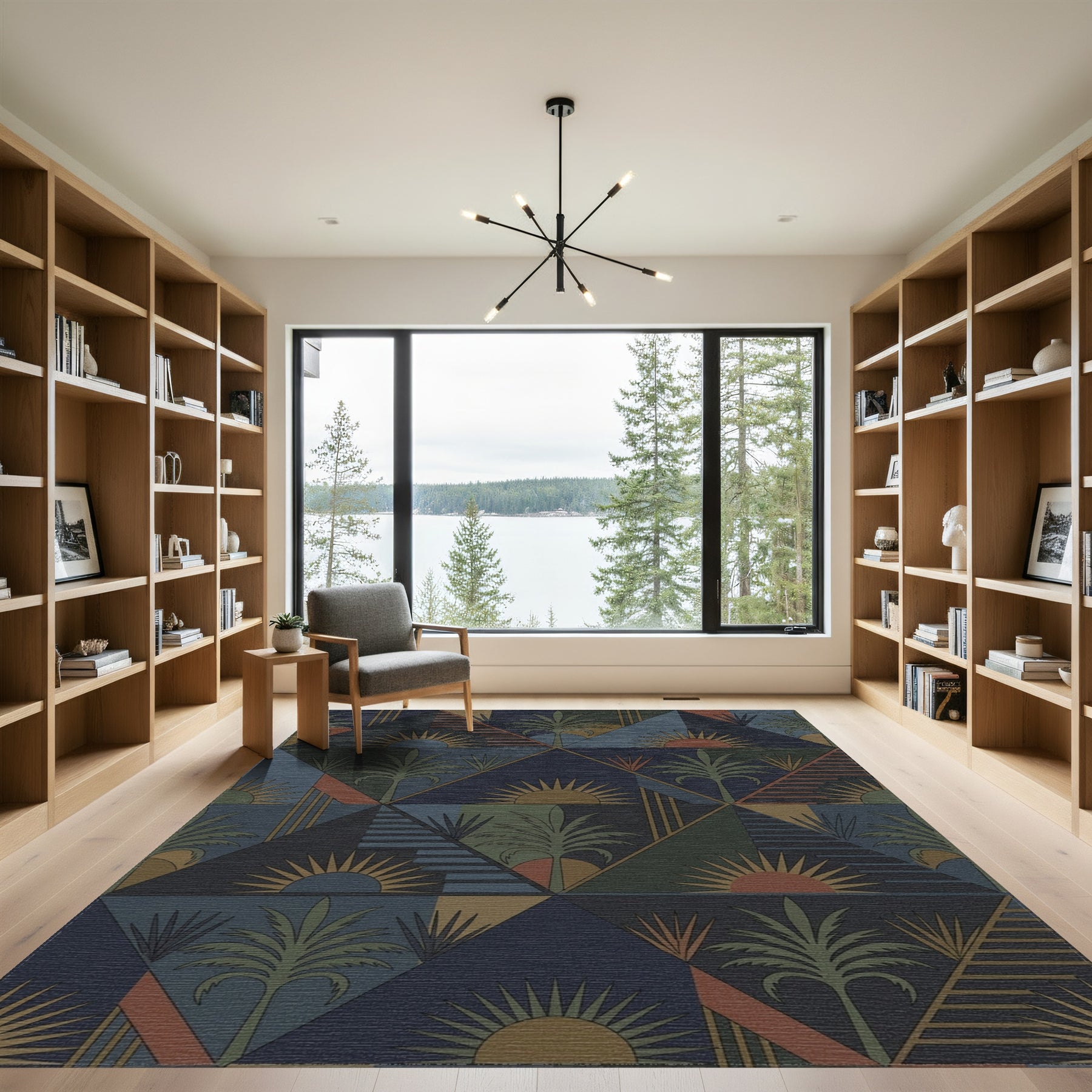 Flatwoven High Traffic Area Rug, Geometric Sunrise Palm Tree Blues Rug, Non Slip, Stain Resistant, Washable Area Rugs for Living Room, Bedroom Overview: