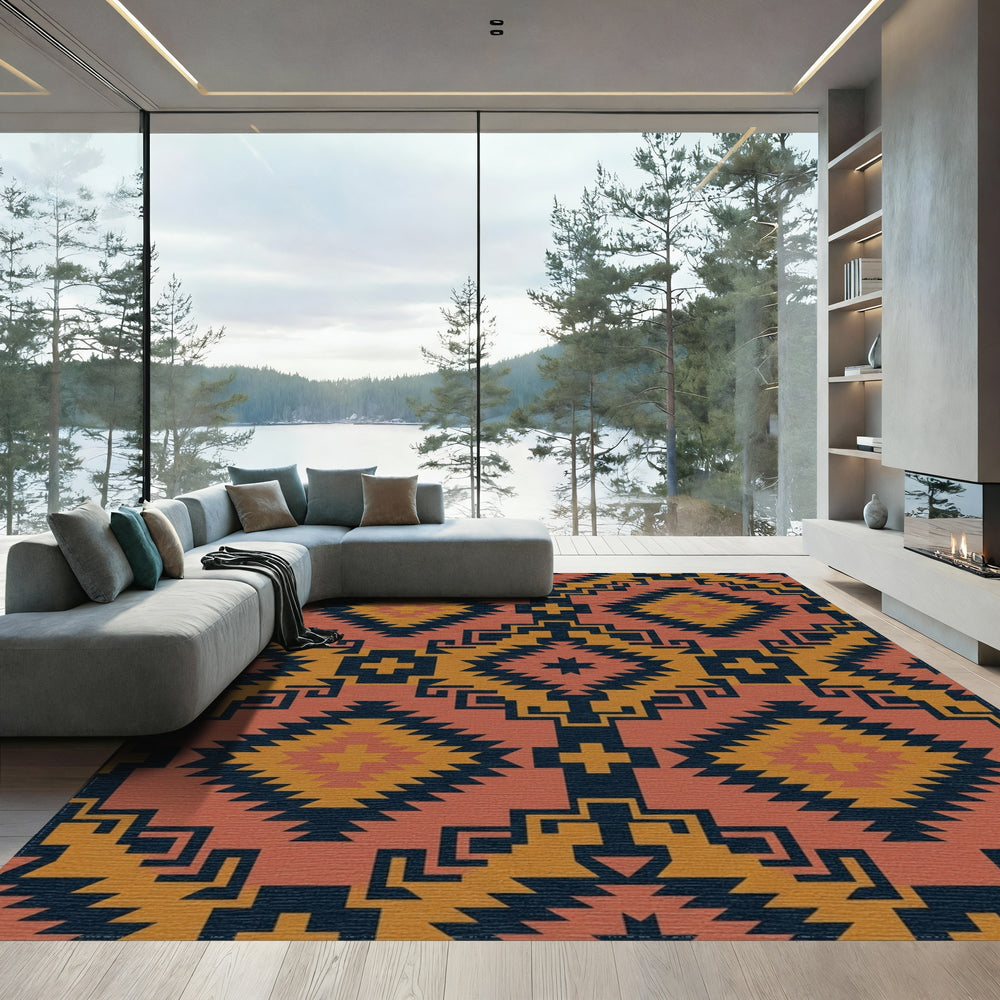 Terracotta Dark Blue Sun Geometric Rug