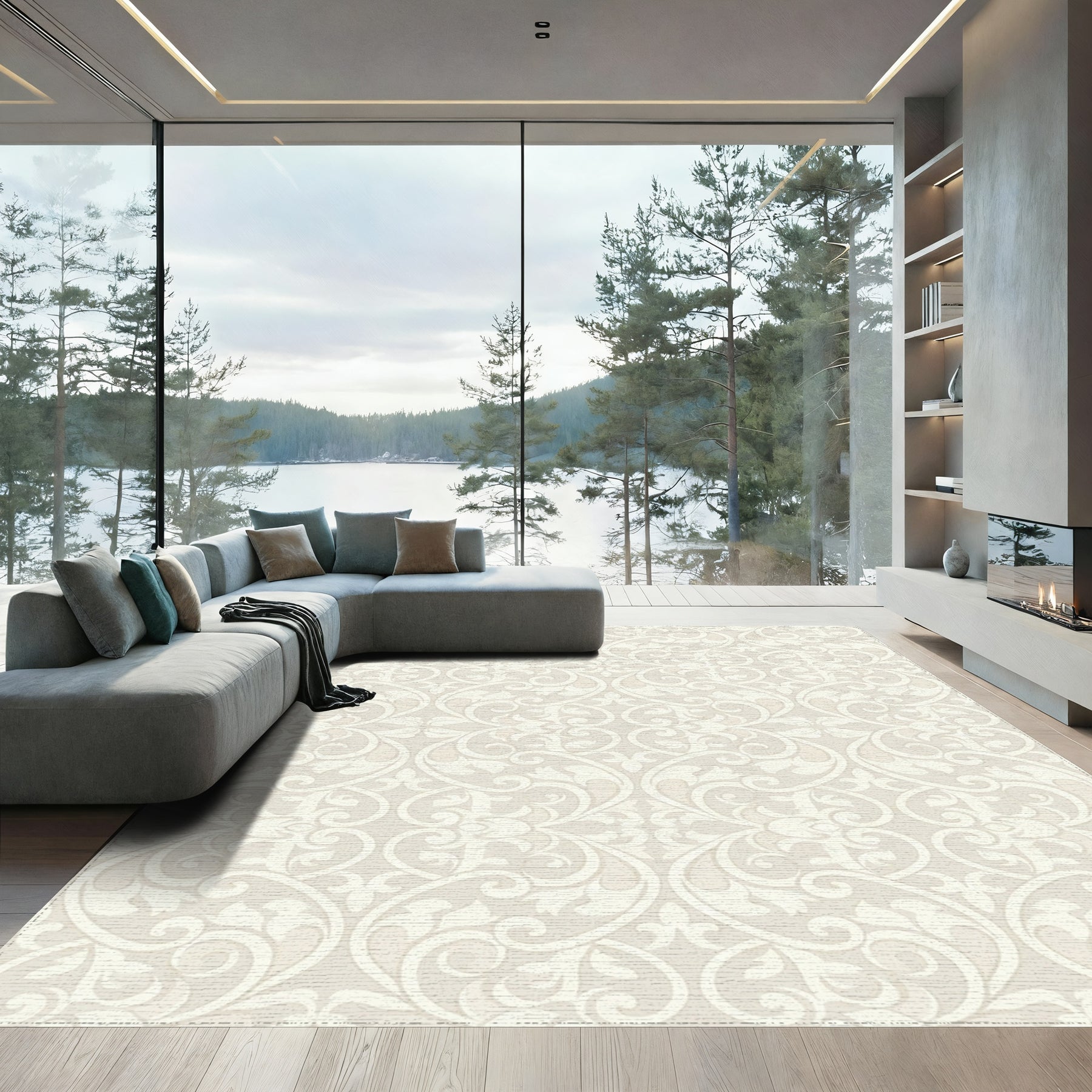 Flatwoven High Traffic Area Rug, Cream Baroque Scroll Lace Rug, Non Slip, Stain Resistant, Washable Area Rugs for Living Room, Bedroom Overview: