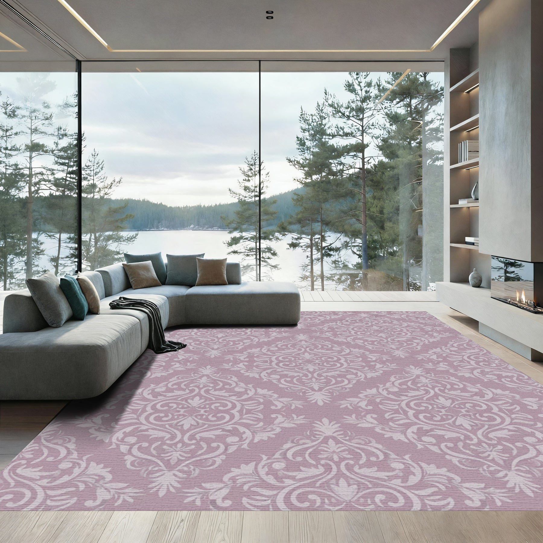 Flatwoven High Traffic Area Rug, Dusty Rose Damask Scroll Rug, Non Slip, Stain Resistant, Washable Area Rugs for Living Room, Bedroom Overview: