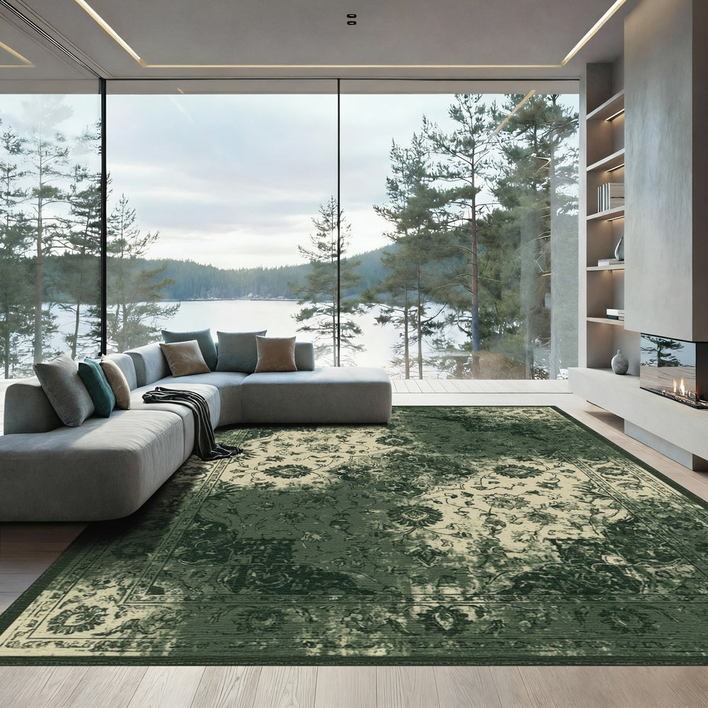 Distressed Green Floral Scroll Rug