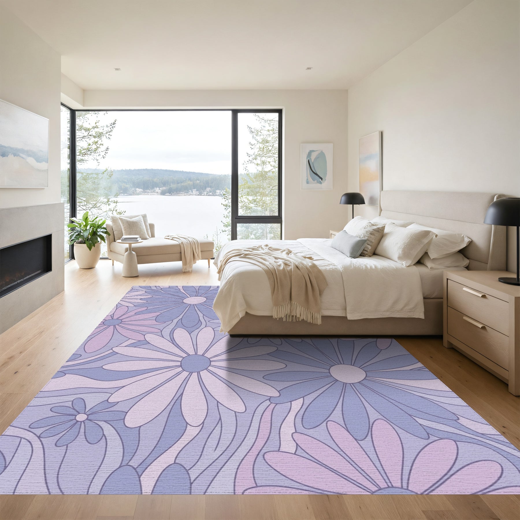 Flatwoven High Traffic Area Rug, Retro Lavender Daisy Swirl Rug, Non Slip, Stain Resistant, Washable Area Rugs for Living Room, Bedroom Overview: