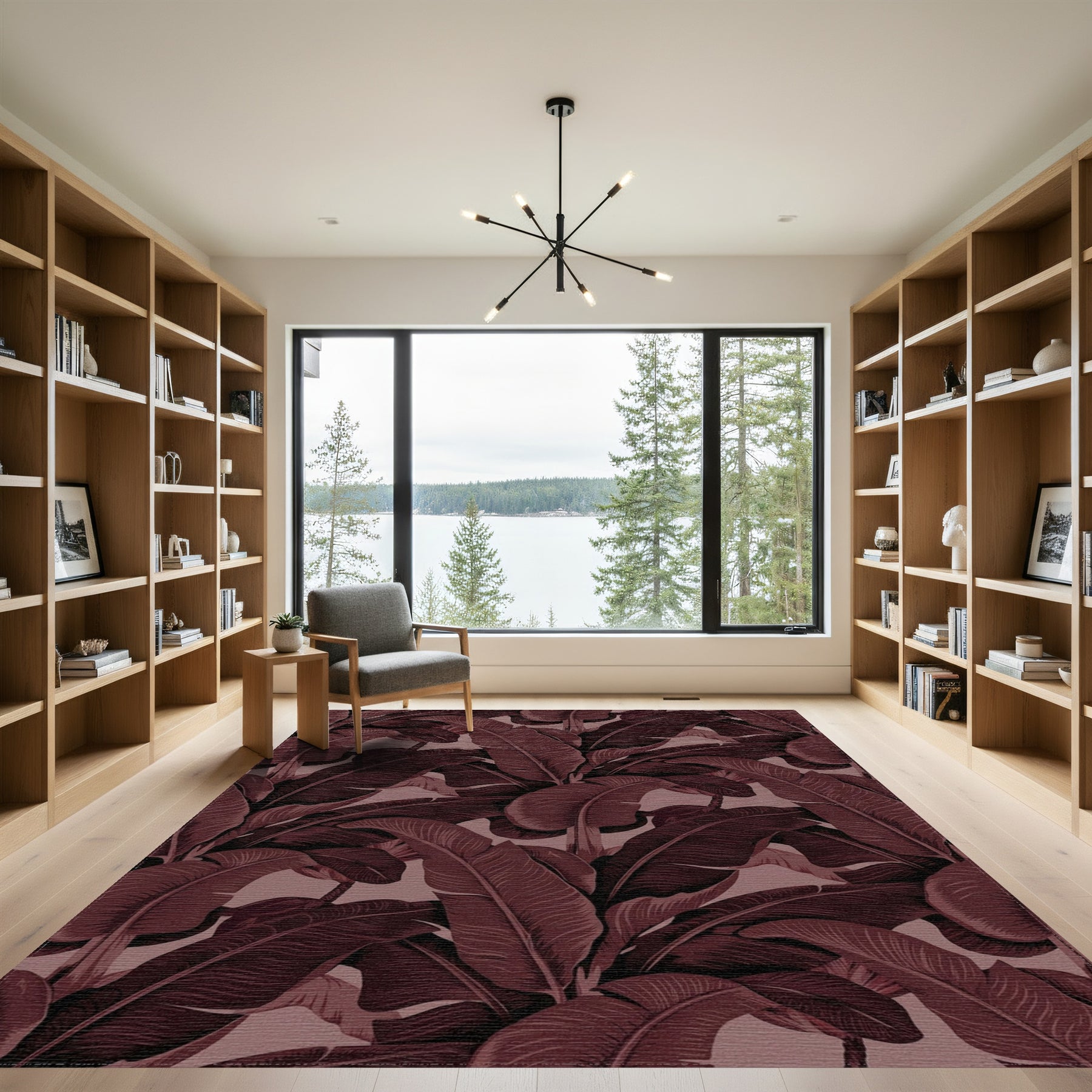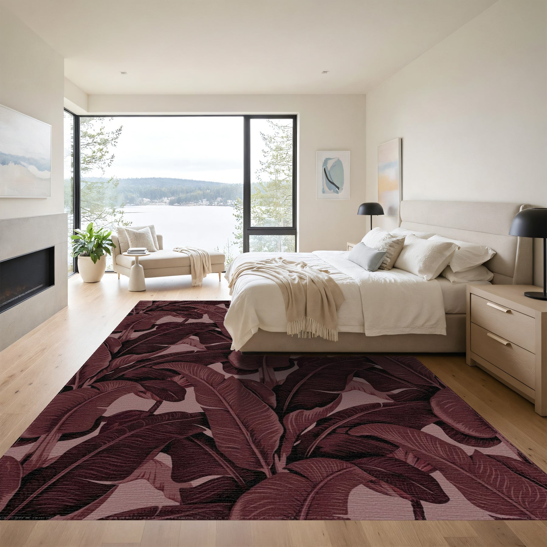 Flatwoven High Traffic Area Rug, Deep Maroon Tropical Banana Leaf Rug, Non Slip, Stain Resistant, Washable Area Rugs for Living Room, Bedroom Overview: