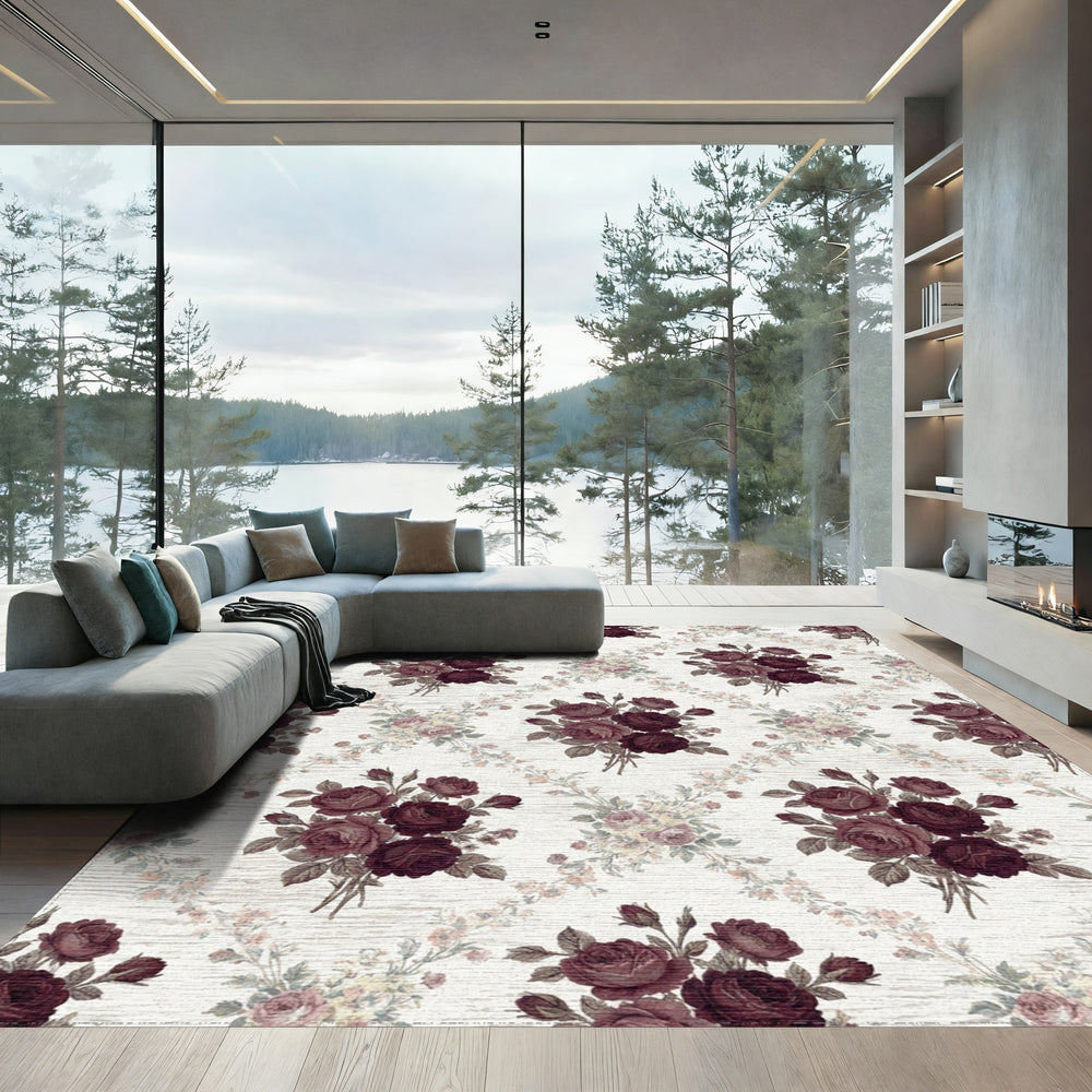 Elegant Burgundy Floral Bouquet Vintage Rug