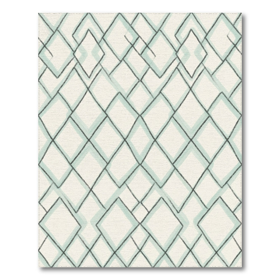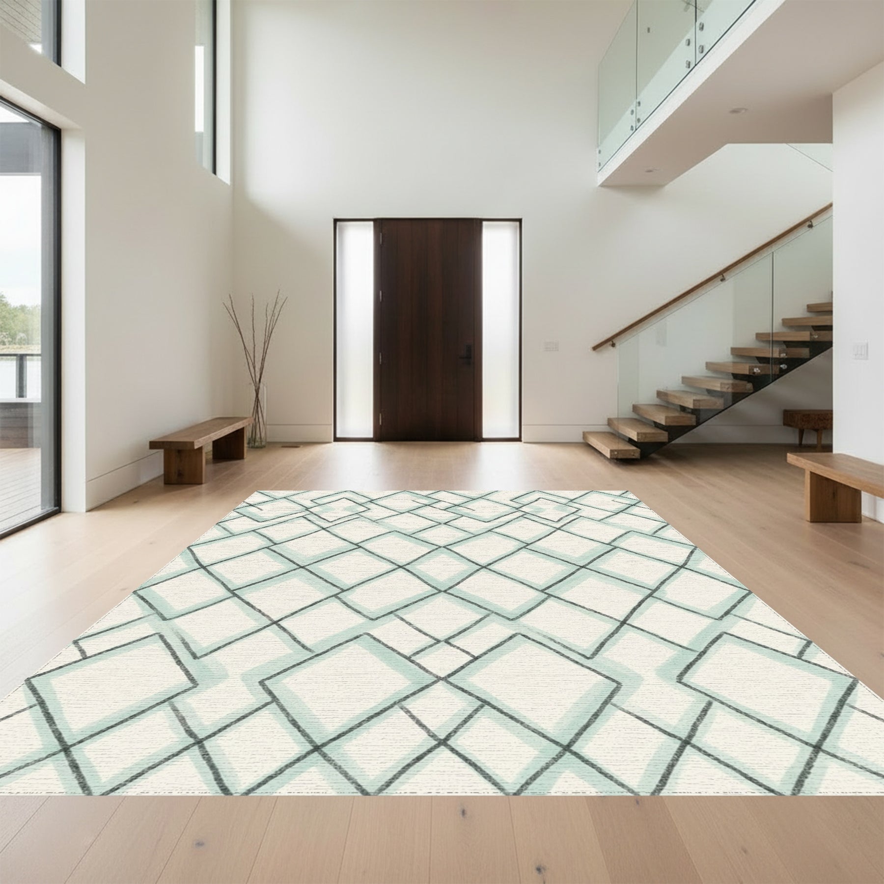 Flatwoven High Traffic Area Rug, Coastal Teal Interlocking Diamond Rug, Non Slip, Stain Resistant, Washable Area Rugs for Living Room, Bedroom Overview: