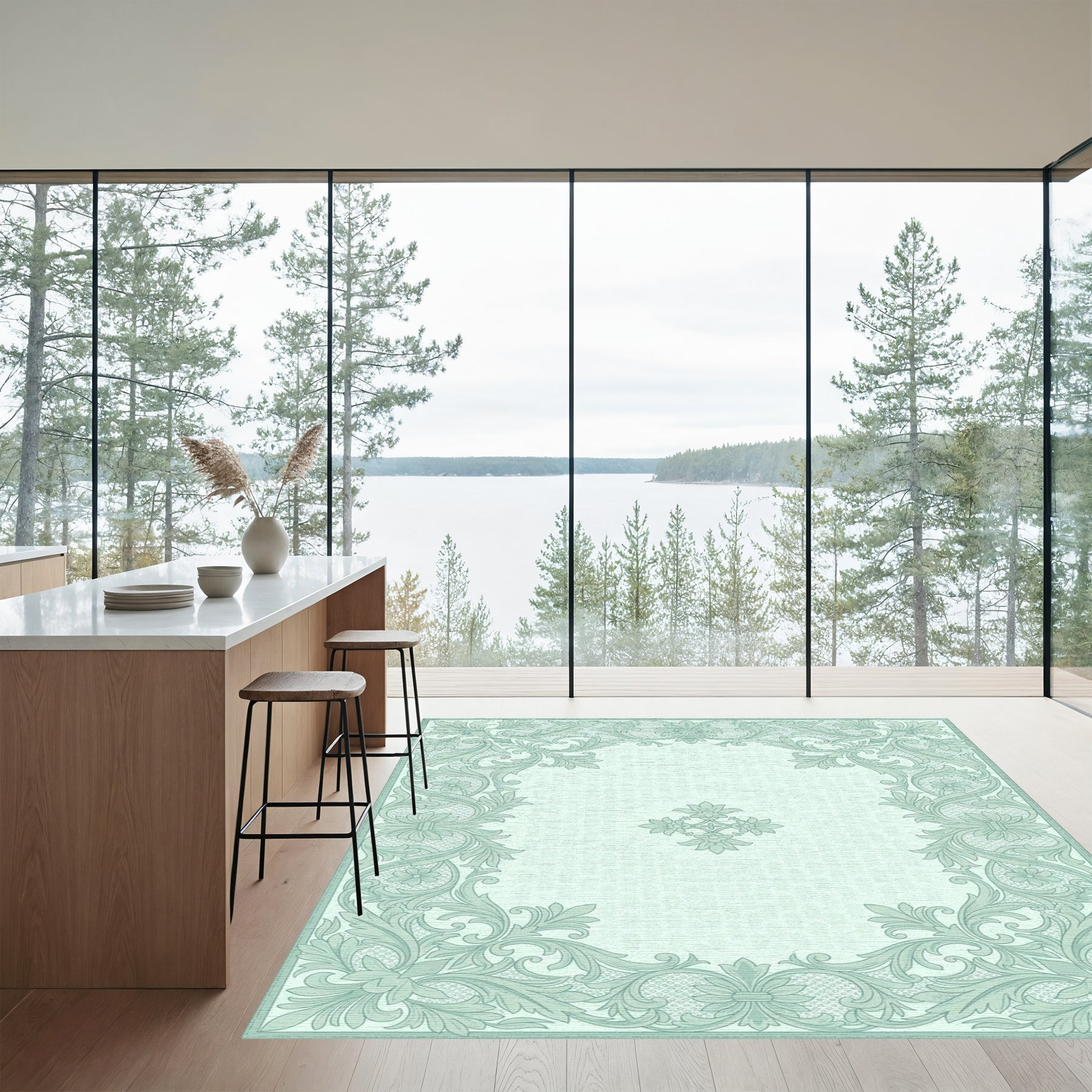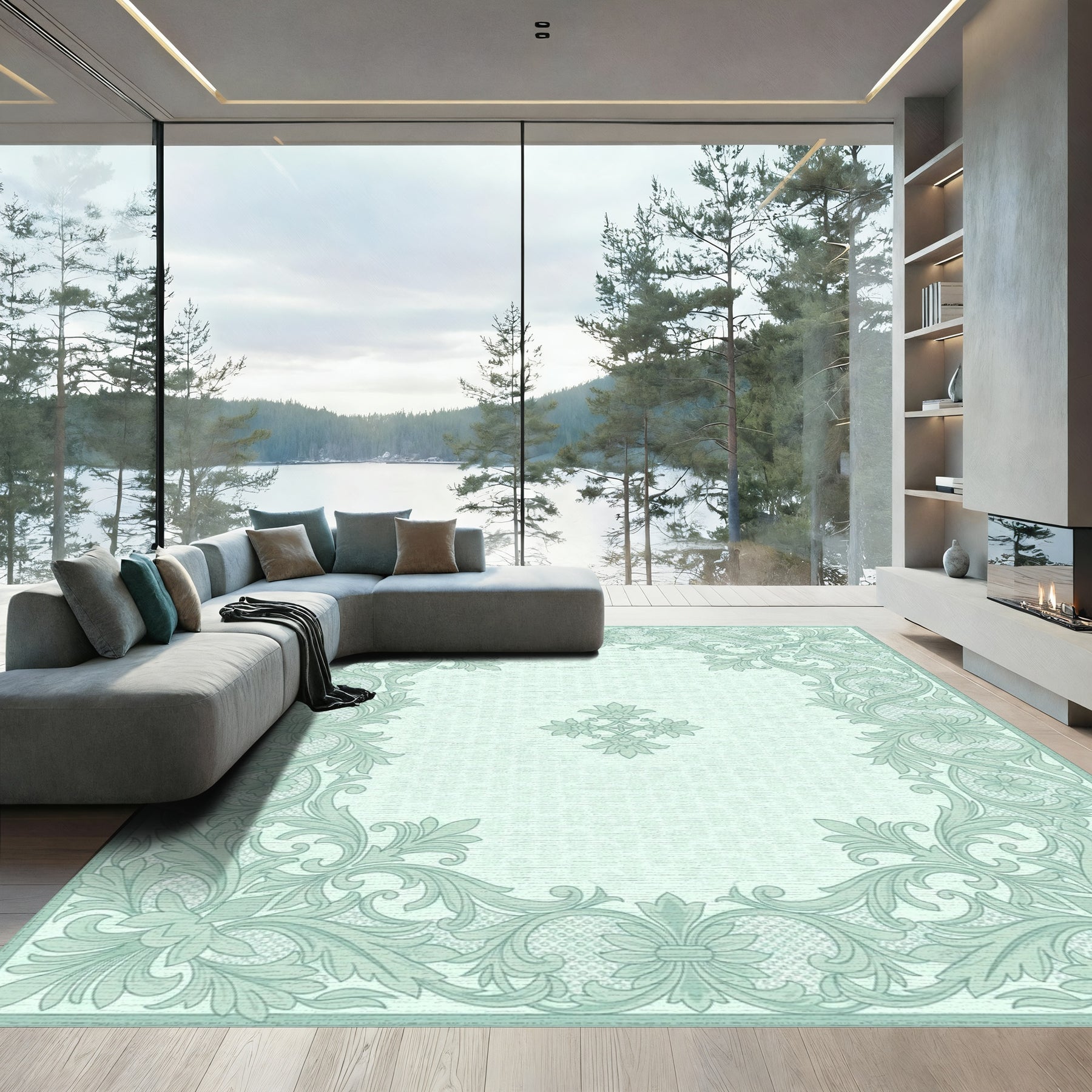 Flatwoven High Traffic Area Rug, Pale Green Floral Scrollwork Medallion Rug, Non Slip, Stain Resistant, Washable Area Rugs for Living Room, Bedroom Overview: