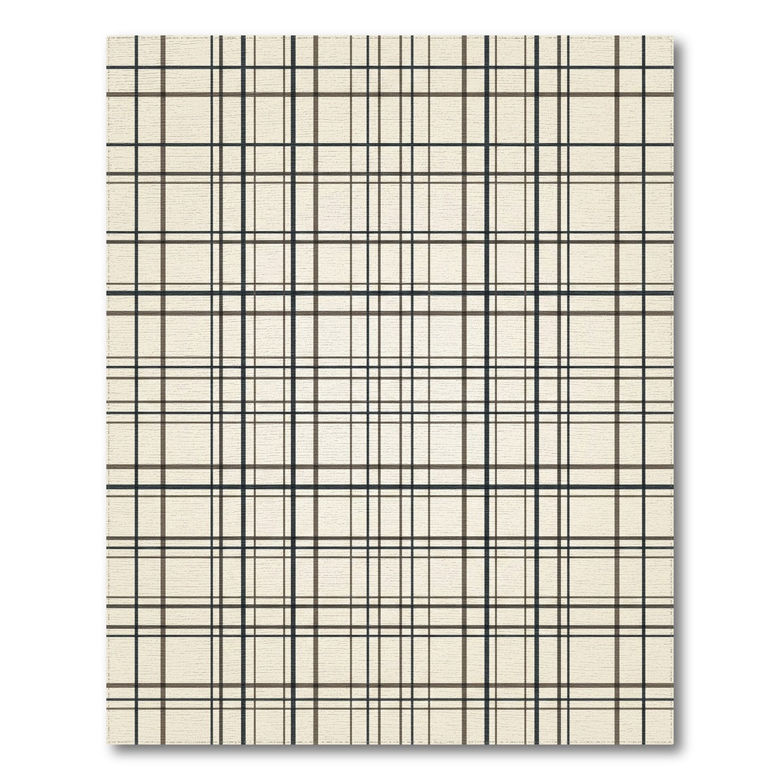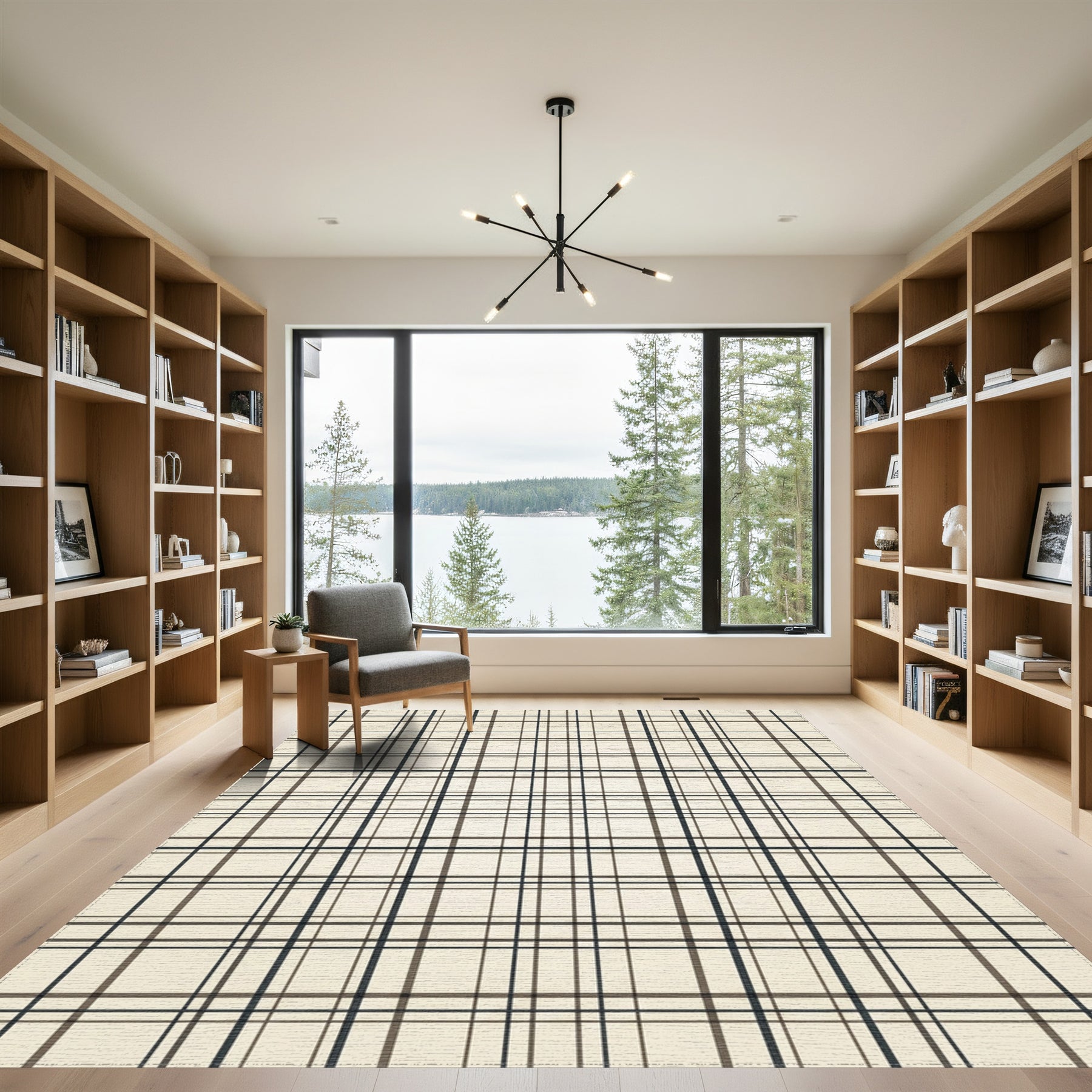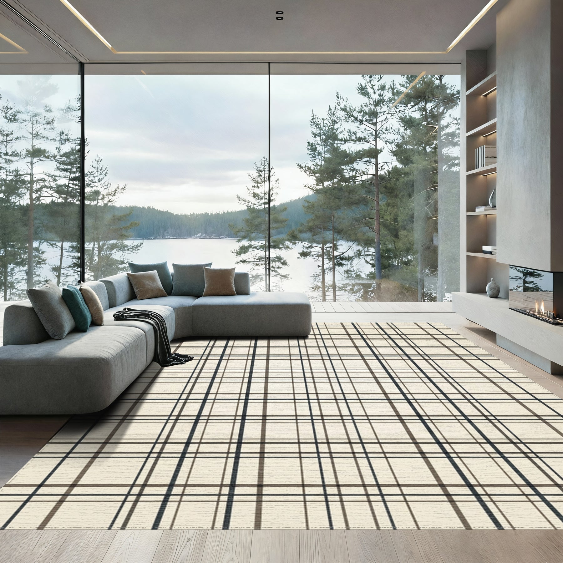 Flatwoven High Traffic Area Rug, Classic Beige Black Plaid Stripes Rug, Non Slip, Stain Resistant, Washable Area Rugs for Living Room, Bedroom Overview: