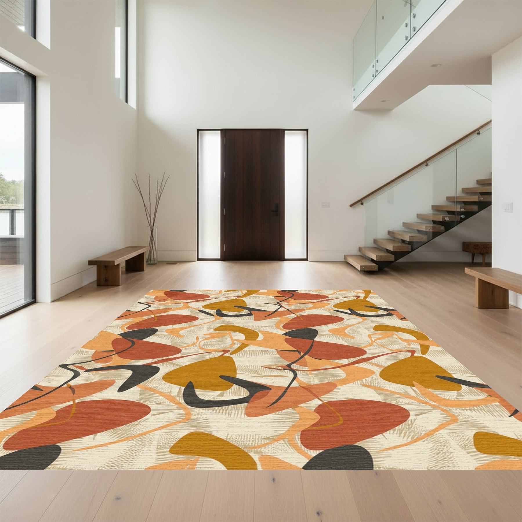 Flatwoven High Traffic Area Rug, Organic Ochre And Burnt Orange Shapes Rug, Non Slip, Stain Resistant, Washable Area Rugs for Living Room, Bedroom Overview: