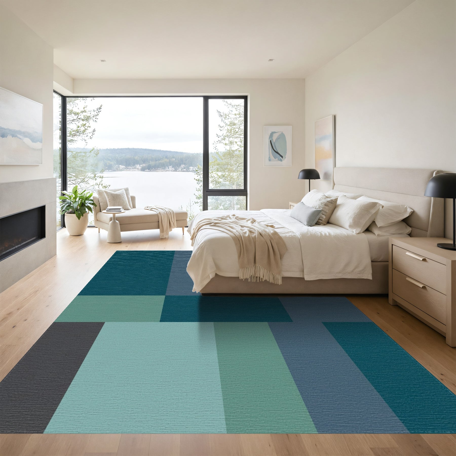 Flatwoven High Traffic Area Rug, Serene Teal Slate Geometric Blocks Rug, Non Slip, Stain Resistant, Washable Area Rugs for Living Room, Bedroom Overview:
