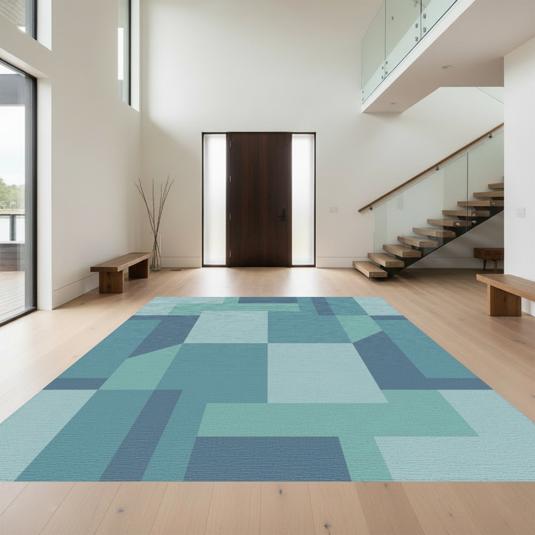 Flatwoven High Traffic Area Rug, Teal Geometric Blocks Composition Rug, Non Slip, Stain Resistant, Washable Area Rugs for Living Room, Bedroom Overview: