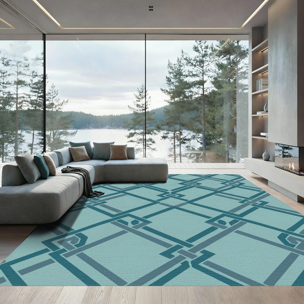 Teal Interlocking Geometric Square Lattice Rug