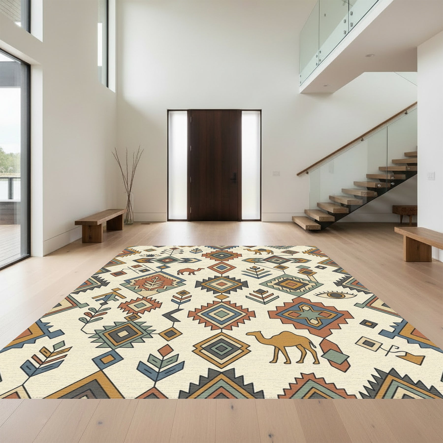 Flatwoven High Traffic Area Rug, Desert Camel Caravan Geometric Medallion Rug, Non Slip, Stain Resistant, Washable Area Rugs for Living Room, Bedroom Overview: